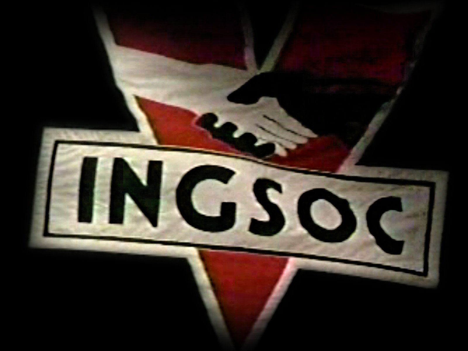 Description: A close up of a sign with a person holding a hand over it's shoulder and the words ingsoc on it.