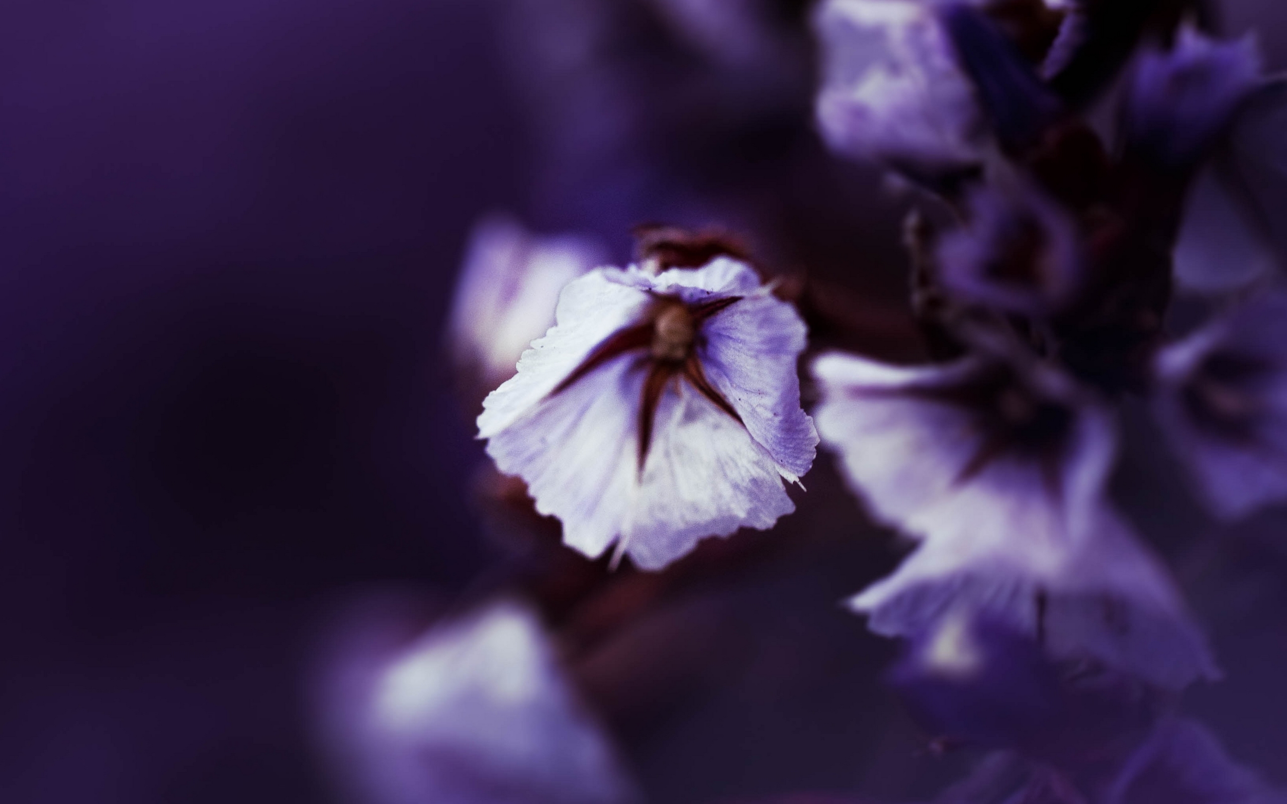 Description: A close up of a flower with a blurry background of purple flowers and leaves in the foreground.