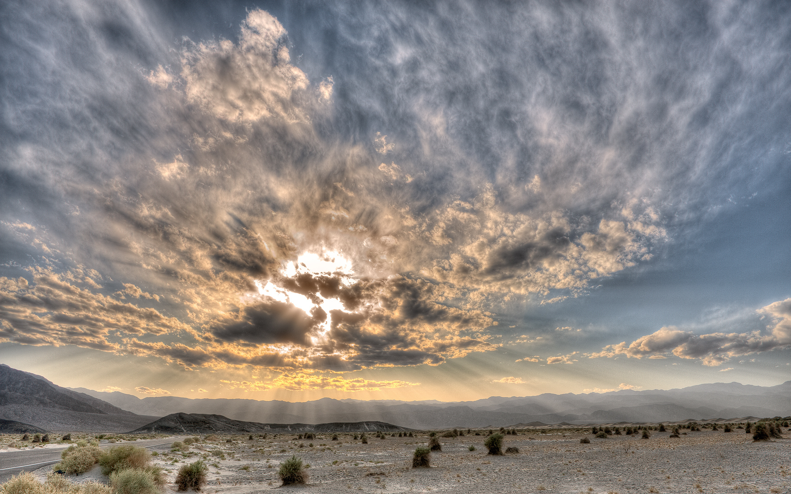 Description: A cloudy sky over a desert with mountains in the background and sun shining through the clouds above it.