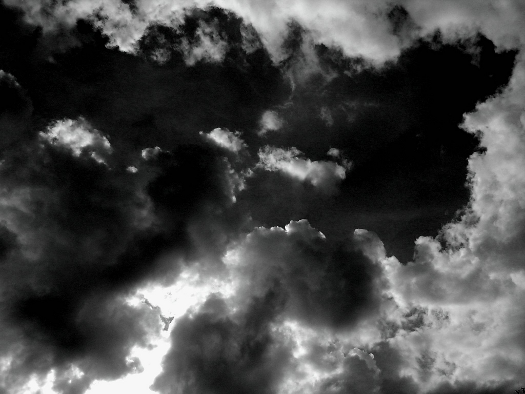 Description: A black and white photo of a cloudy sky with a plane in the distance and a plane in the foreground.