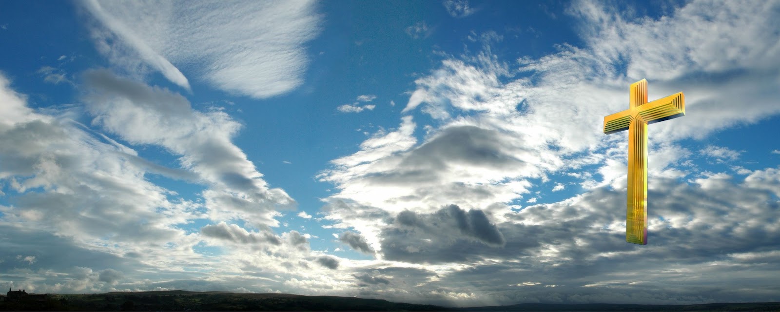 Description: A cross is in the middle of a cloudy sky with a blue sky in the background and a yellow cross in the foreground.