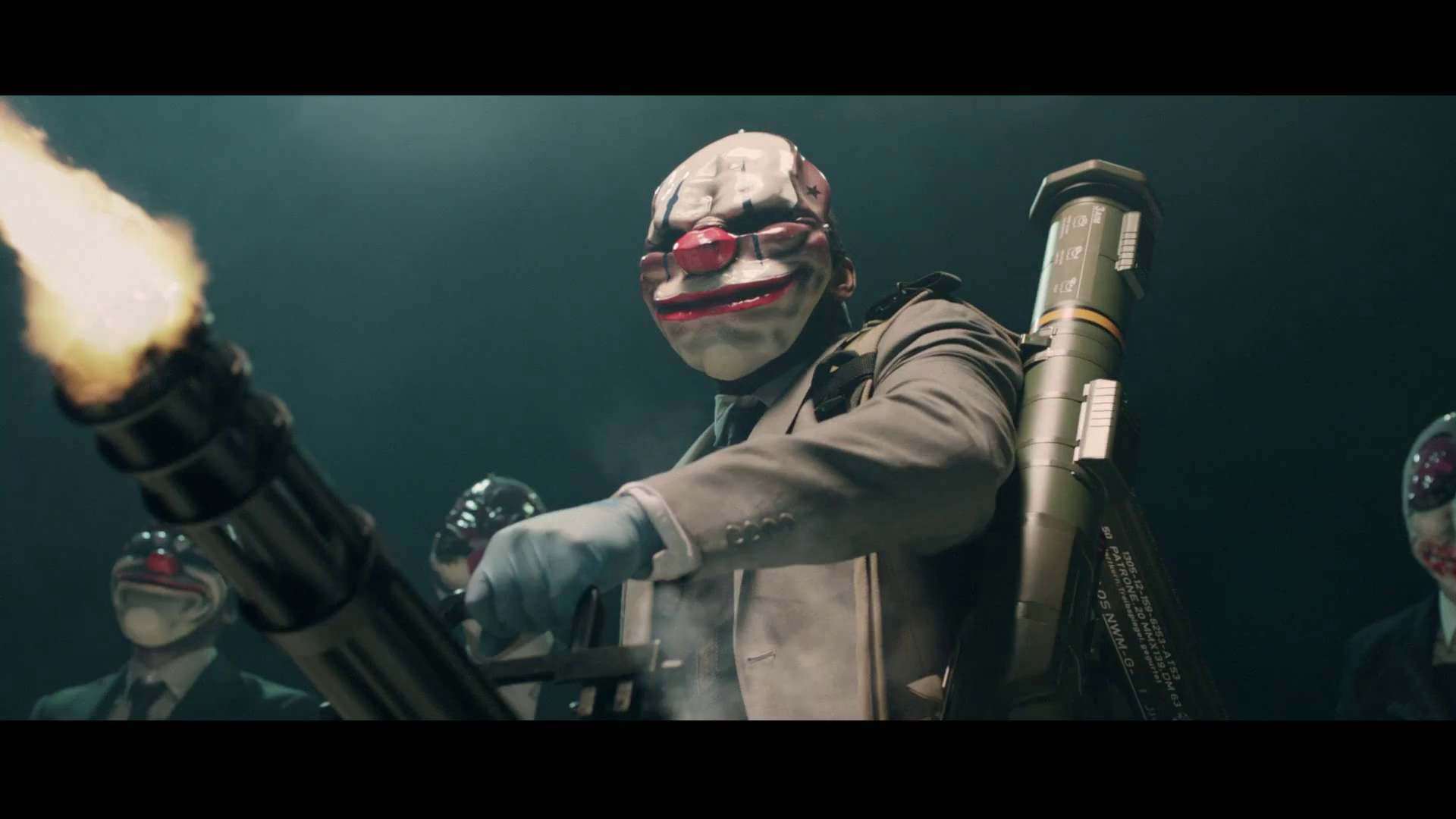 Description: A man in a clown mask holding a large gun and a flame in his hand with other men in the background.