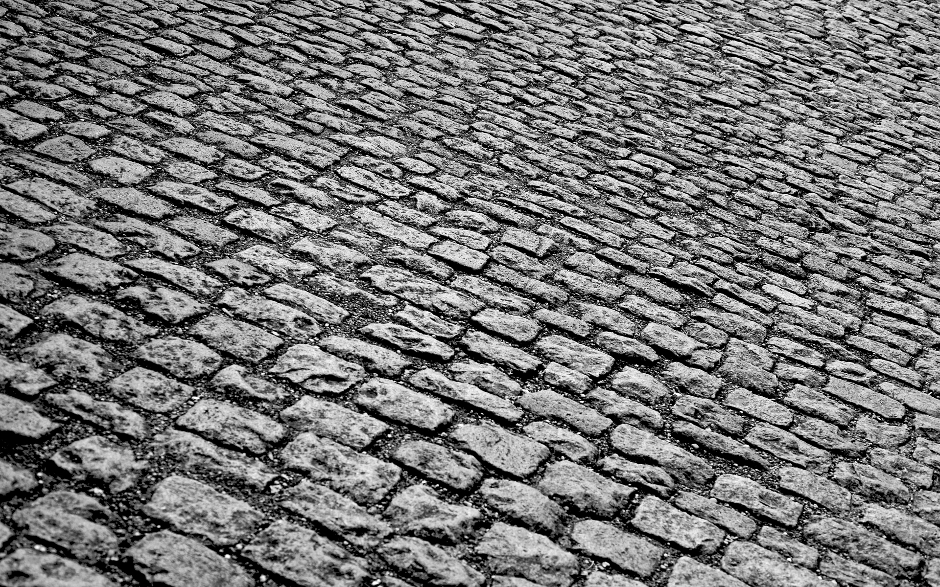 Description: A black and white photo of a cobblestone street with a stop sign on it's side.