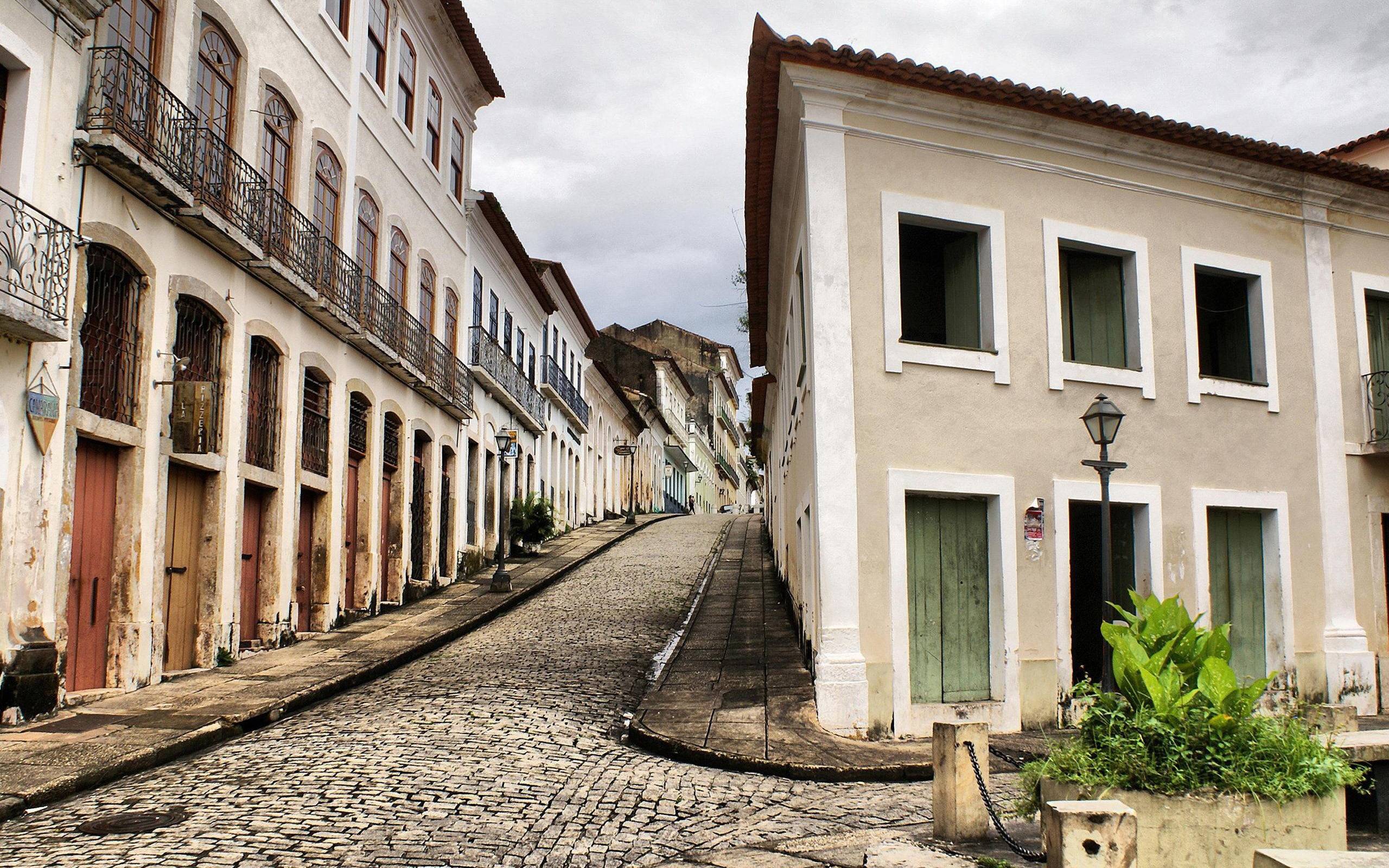 Description: A cobblestone street with a few buildings on both sides of it and a lamp post on the side.
