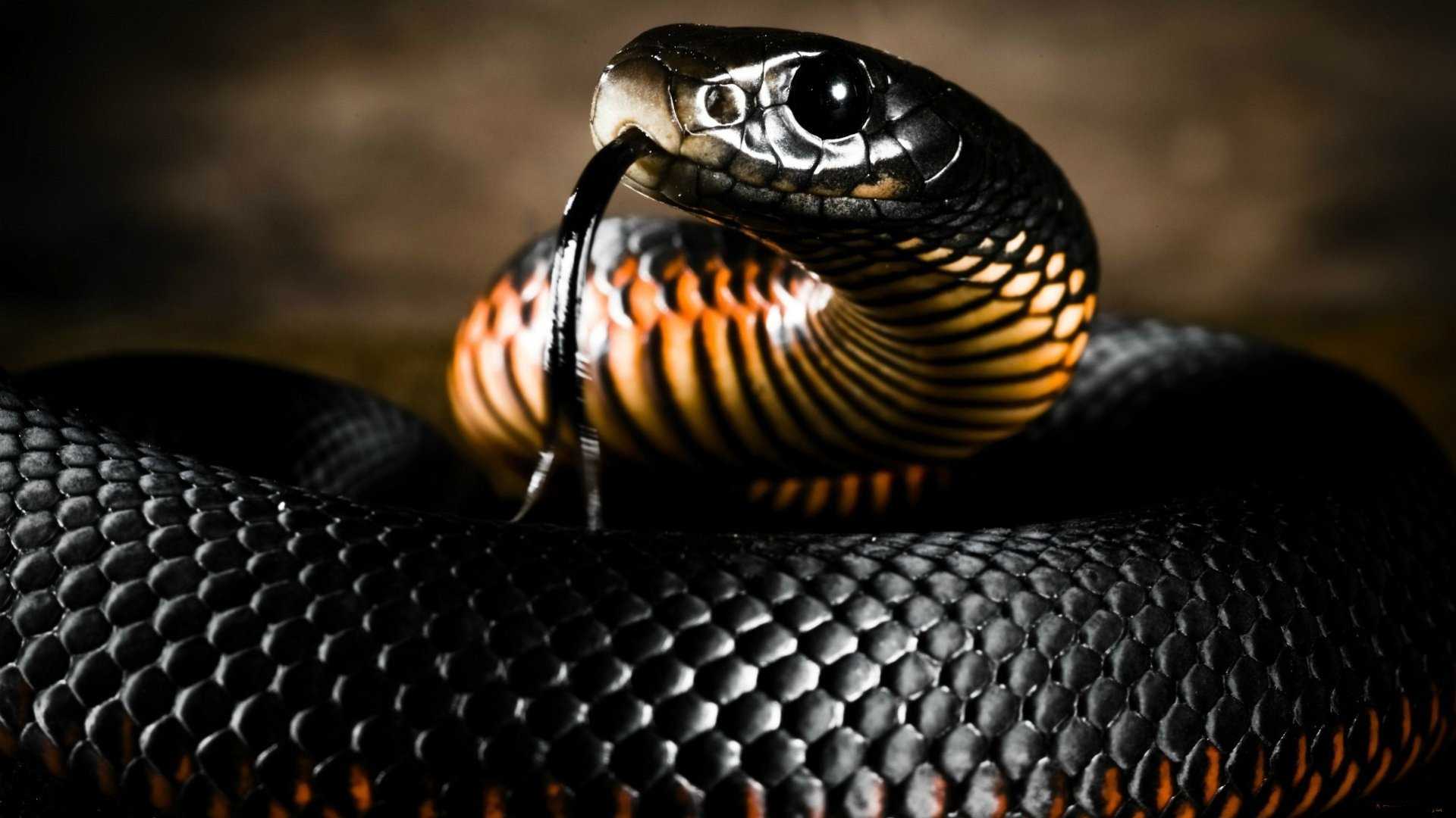 Description: A snake with a black and orange stripe on its head and neck.