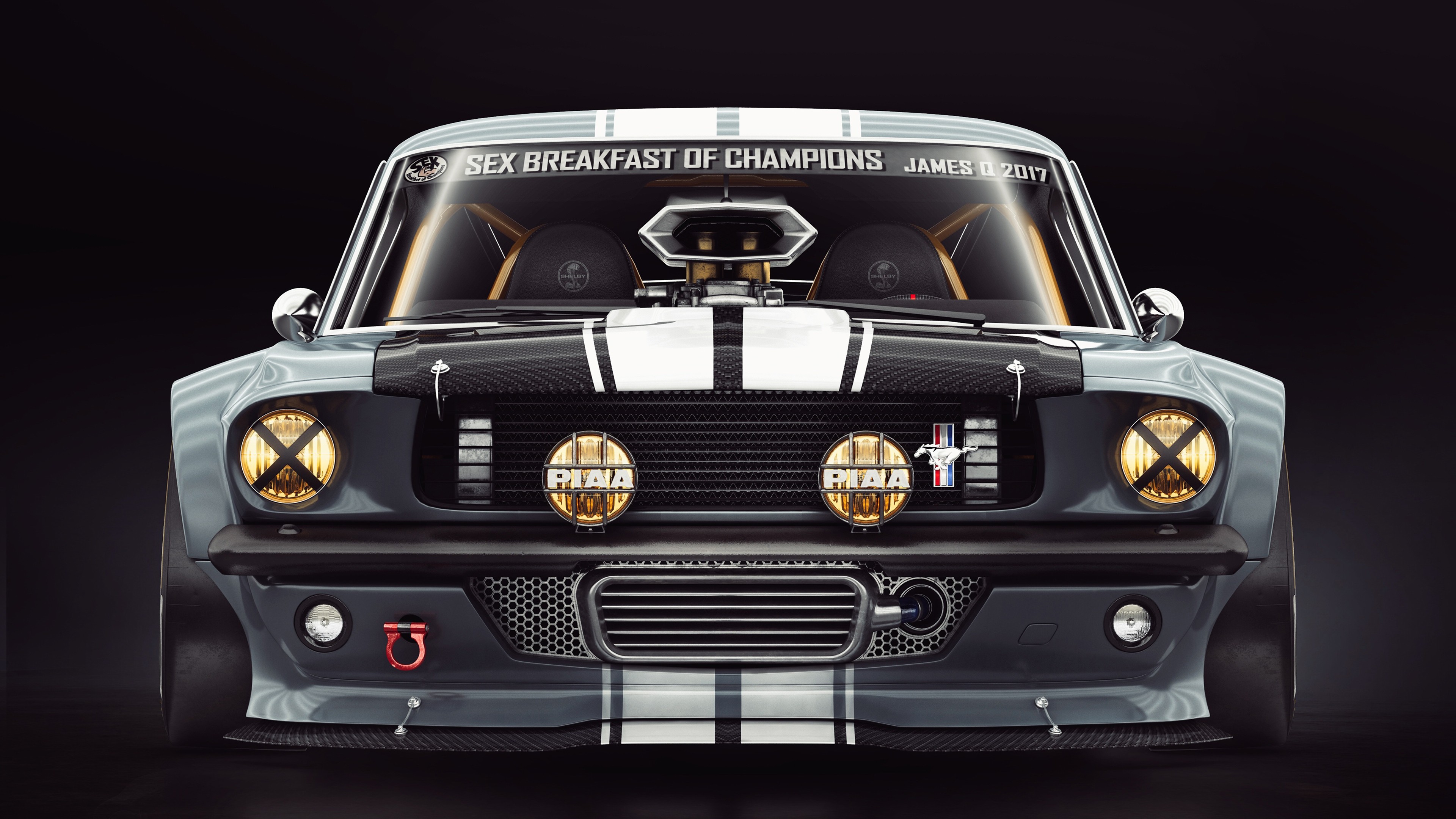 Description: A car with a racing stripe on it's hood and hood lights on it's hood.