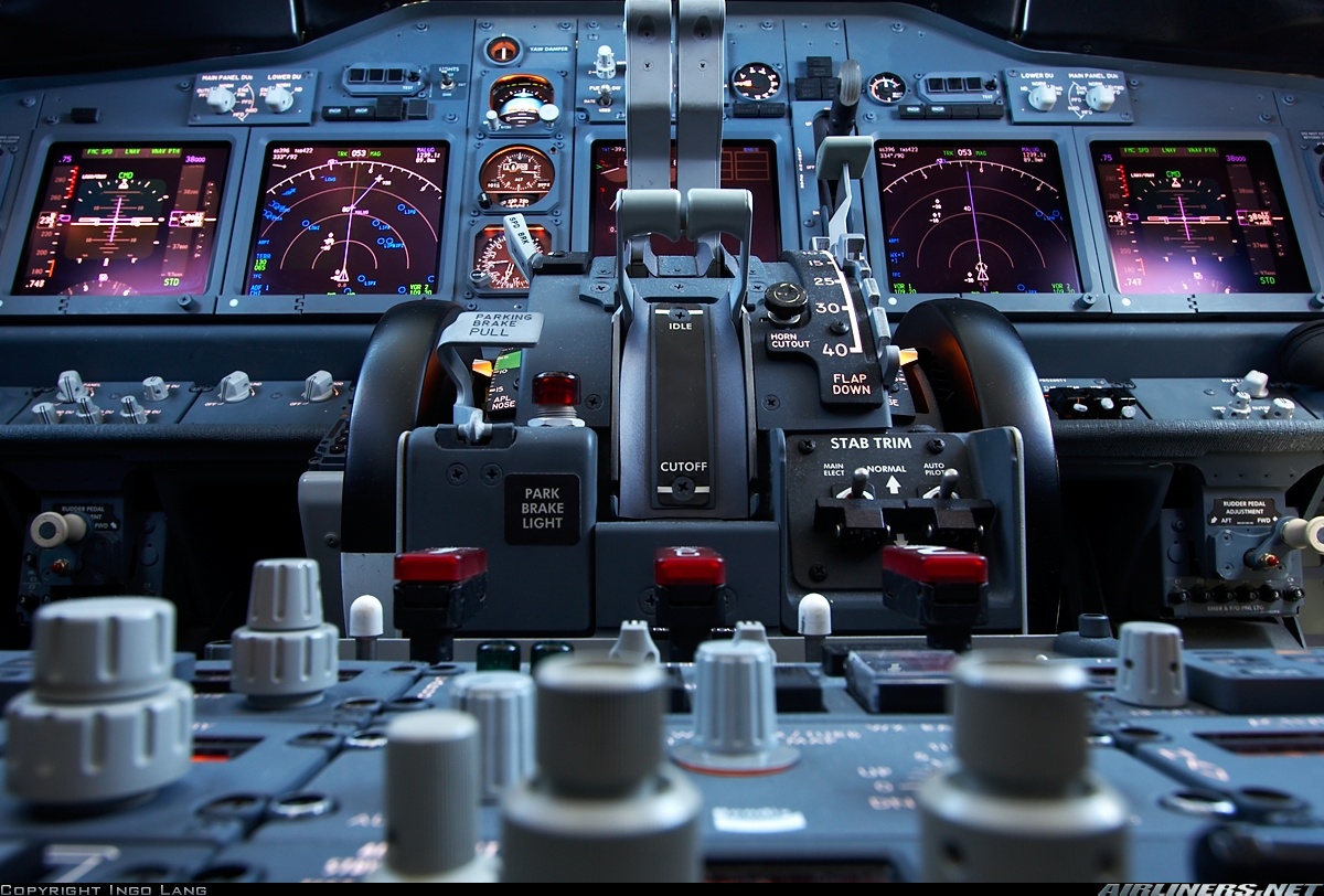 Description: A cockpit of a plane with multiple controls and a few lights on it's sides and a few other controls on the sides.