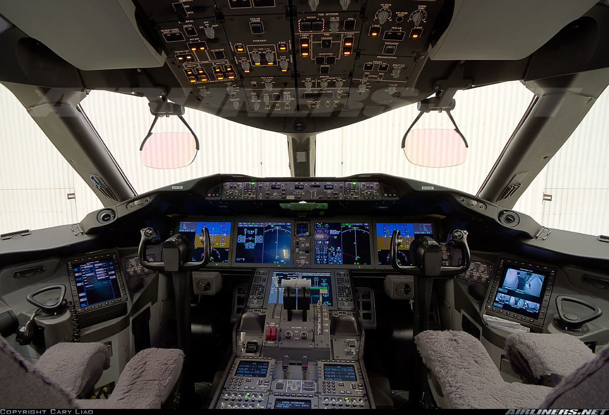 Description: A view of the cockpit of a plane from the inside of the plane.