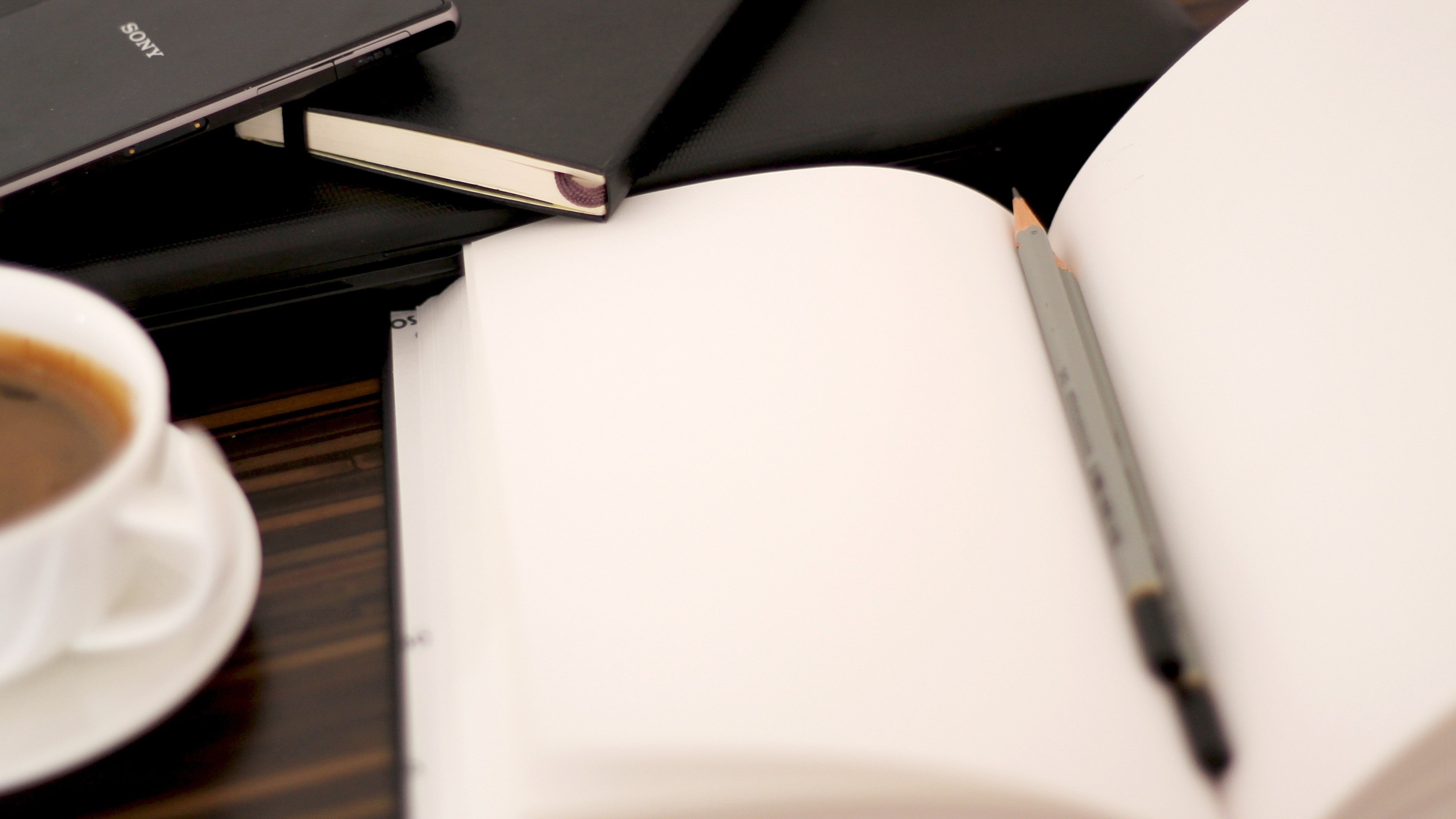 Description: A cup of coffee and a book on a table with a pen and a laptop computer on it and a cup of coffee.