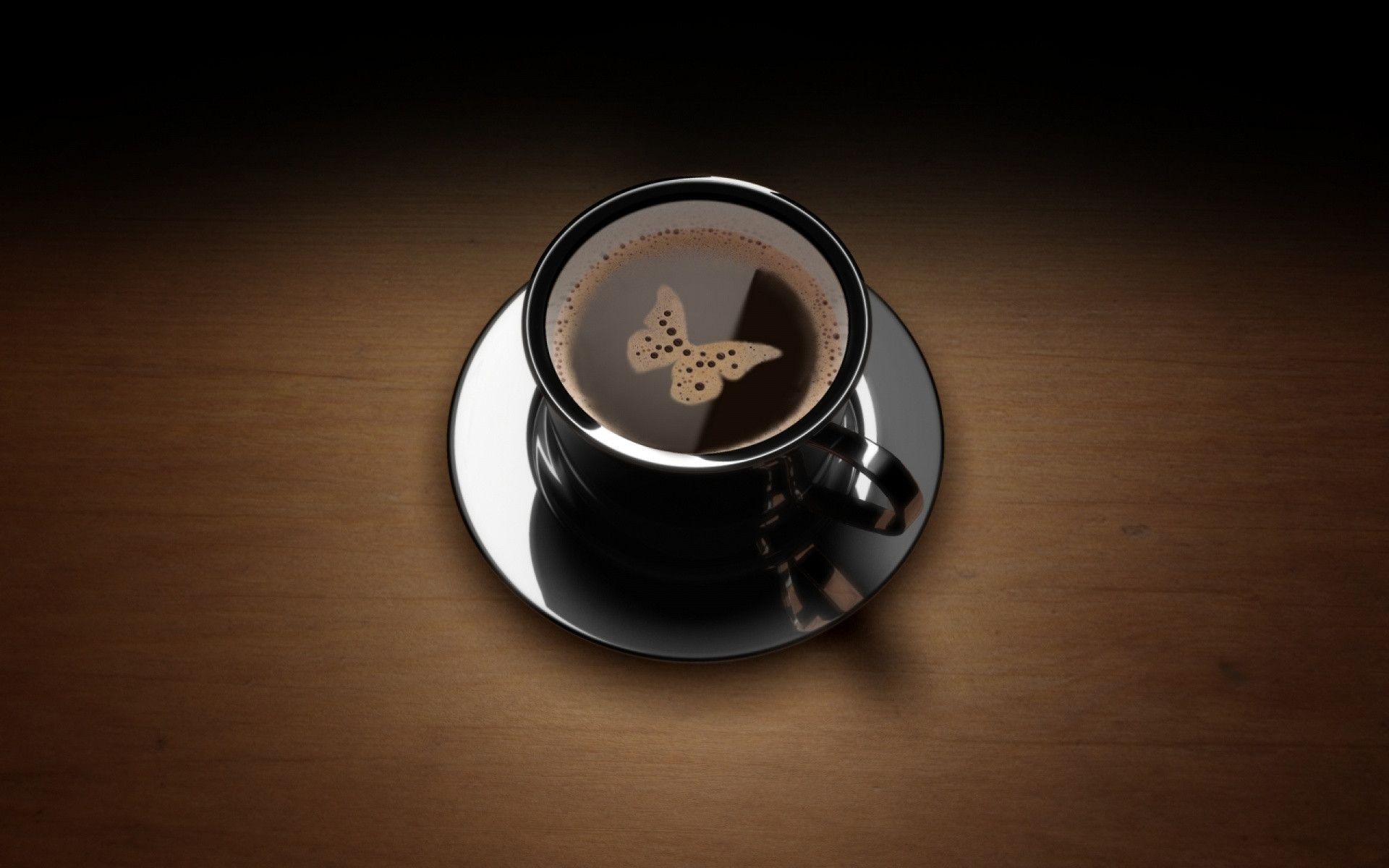 Description: A cup of coffee with a butterfly on it on a saucer on a wooden table with a black background.