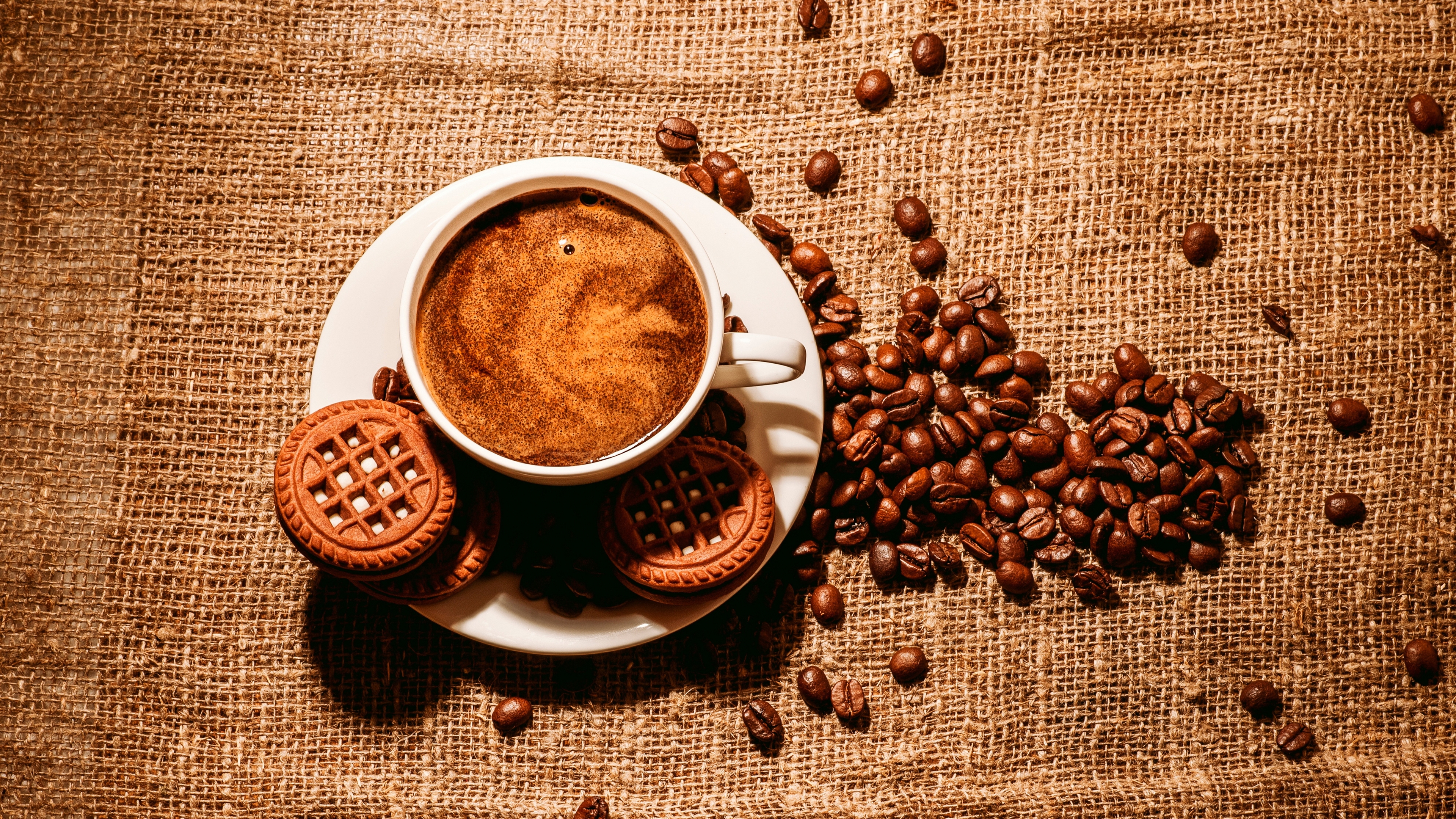 Description: A cup of coffee and some cookies on a table with burlap cloth and coffee beans on the table.