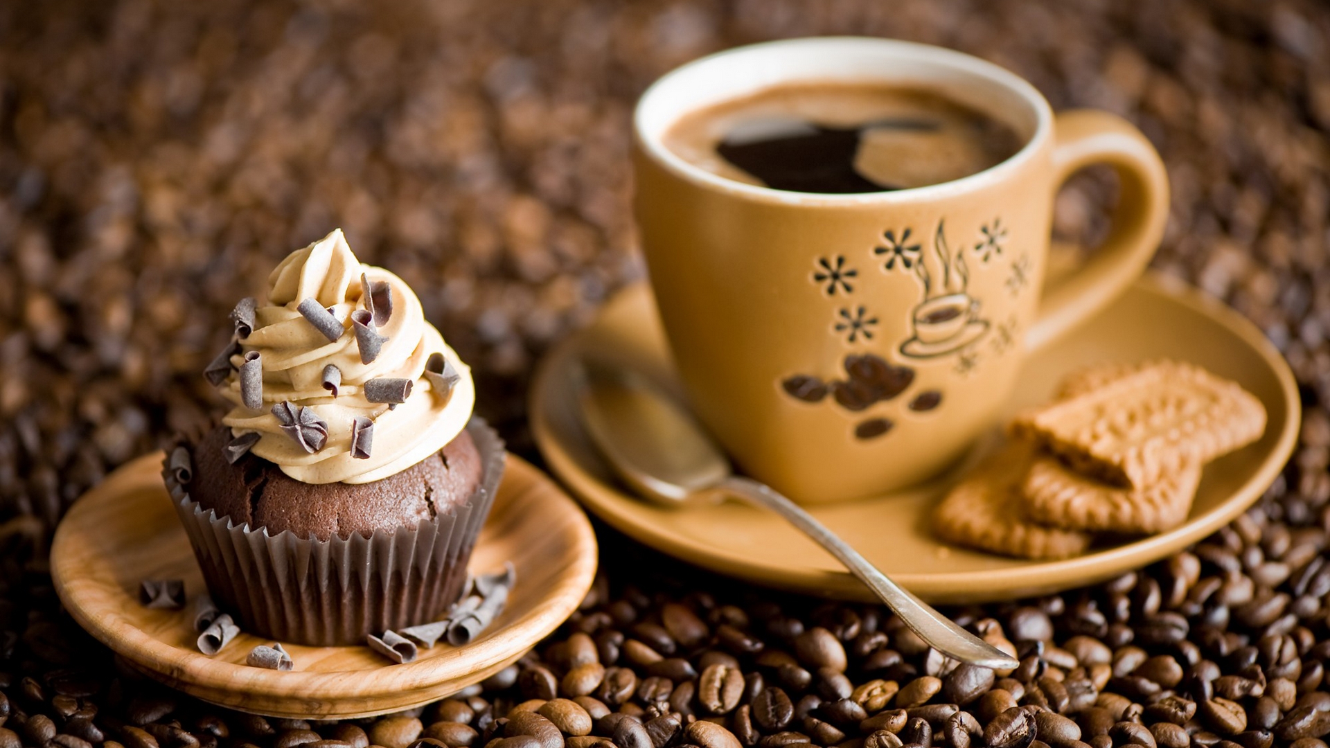 Description: A cup of coffee and a plate of cookies on a table with coffee beans and a spoon on it.