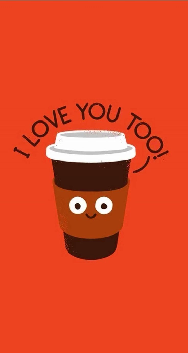 Description: A coffee cup with a face drawn on it with the words i love you too above it and a coffee cup with eyes drawn on it.