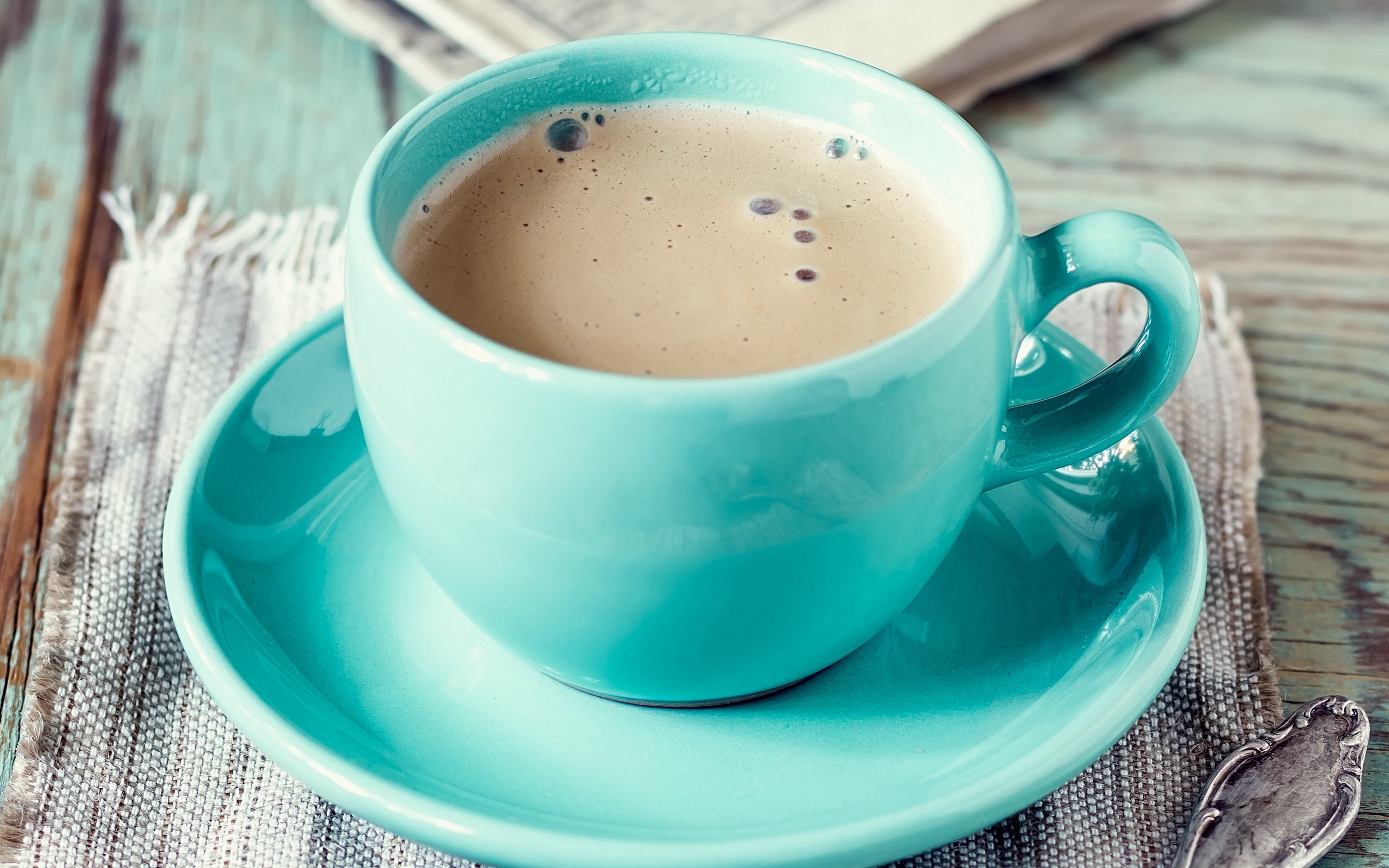 Description: A cup of coffee on a saucer with a spoon on a table next to a napkin and a book.