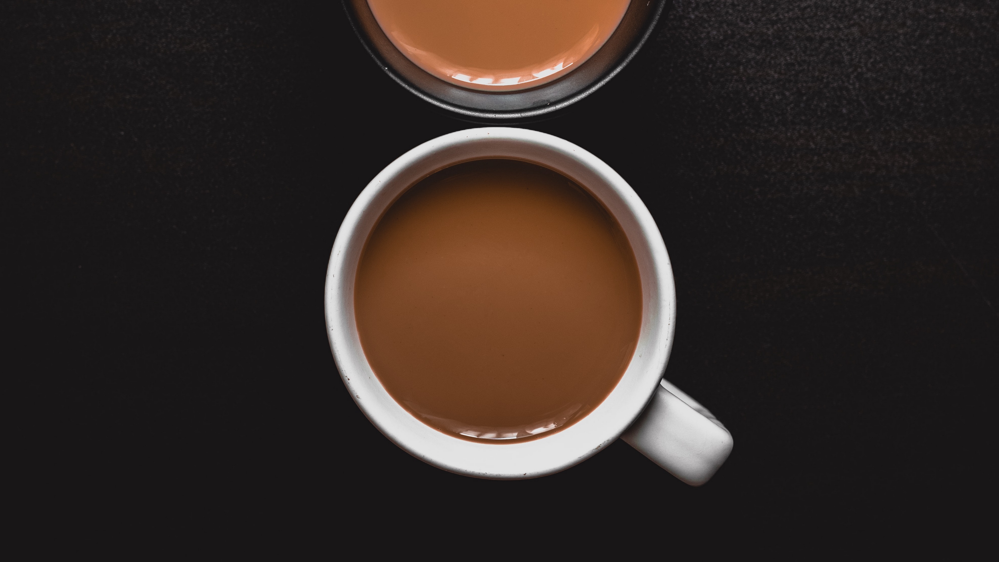 Description: Two cups of coffee sitting on top of a table next to each other on a black surface with a black background.