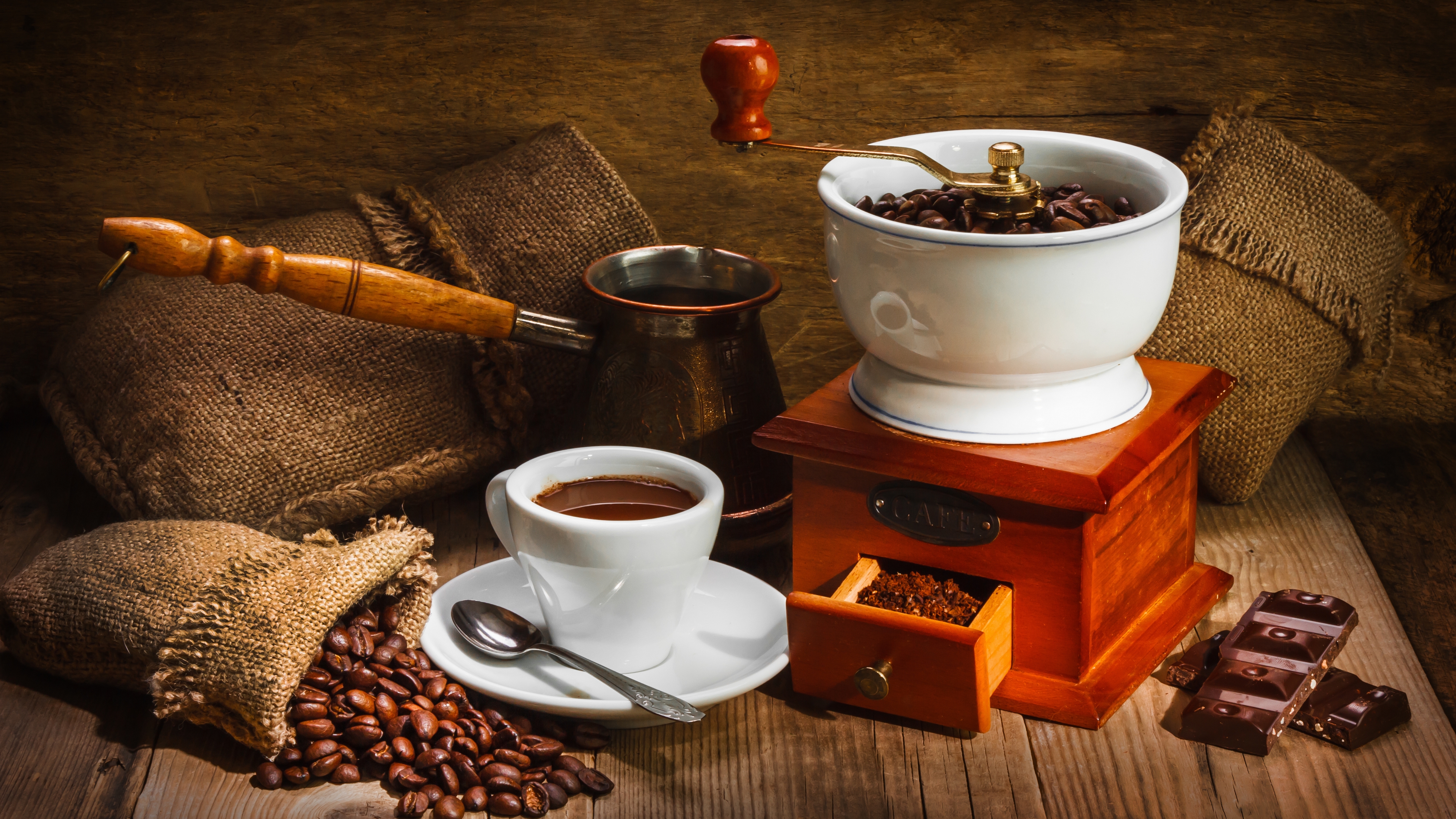 Description: A coffee maker with a cup of coffee and a spoon on a table with coffee beans and a sack of burl.