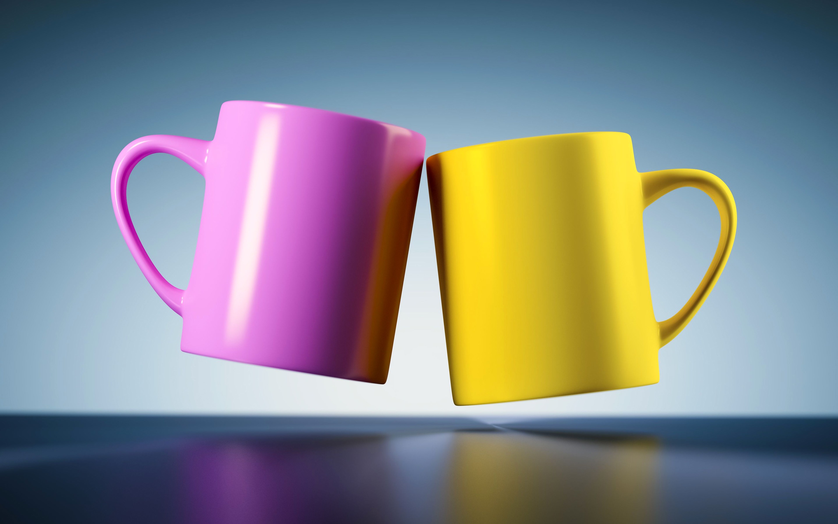 Description: Two coffee mugs are sitting side by side on a table.