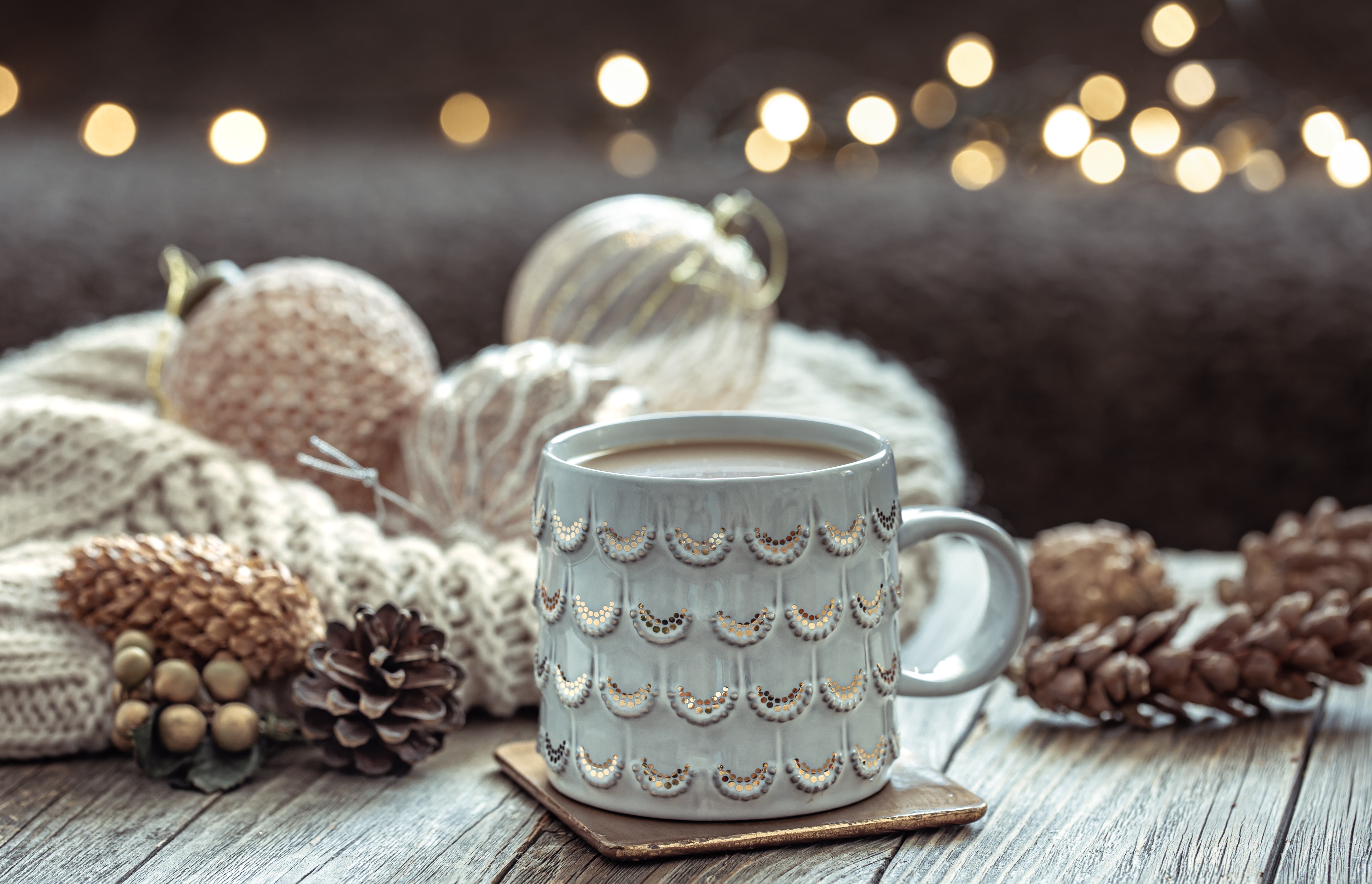 Description: A cup of coffee sitting on top of a wooden table next to a pile of pine cones and a knitted scarf.