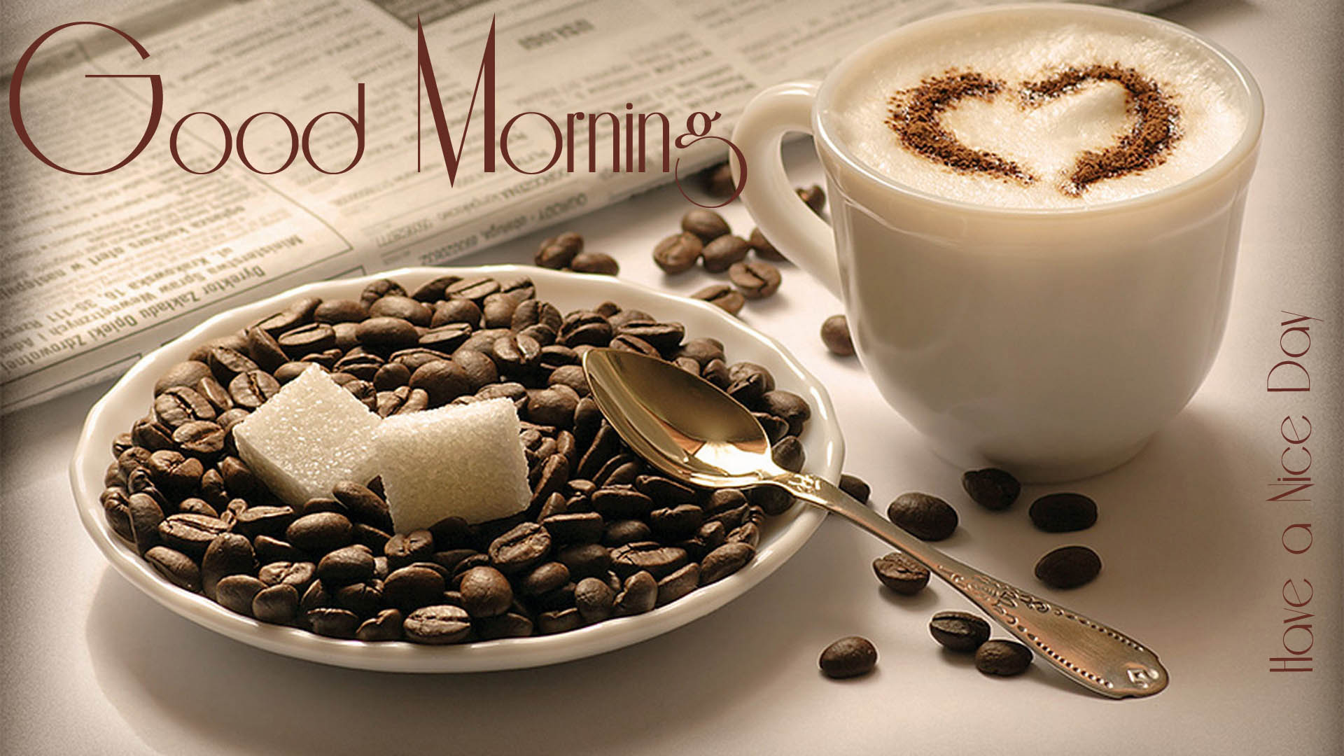 Description: A cup of coffee and a plate of beans with a heart on it and a spoon on a table.