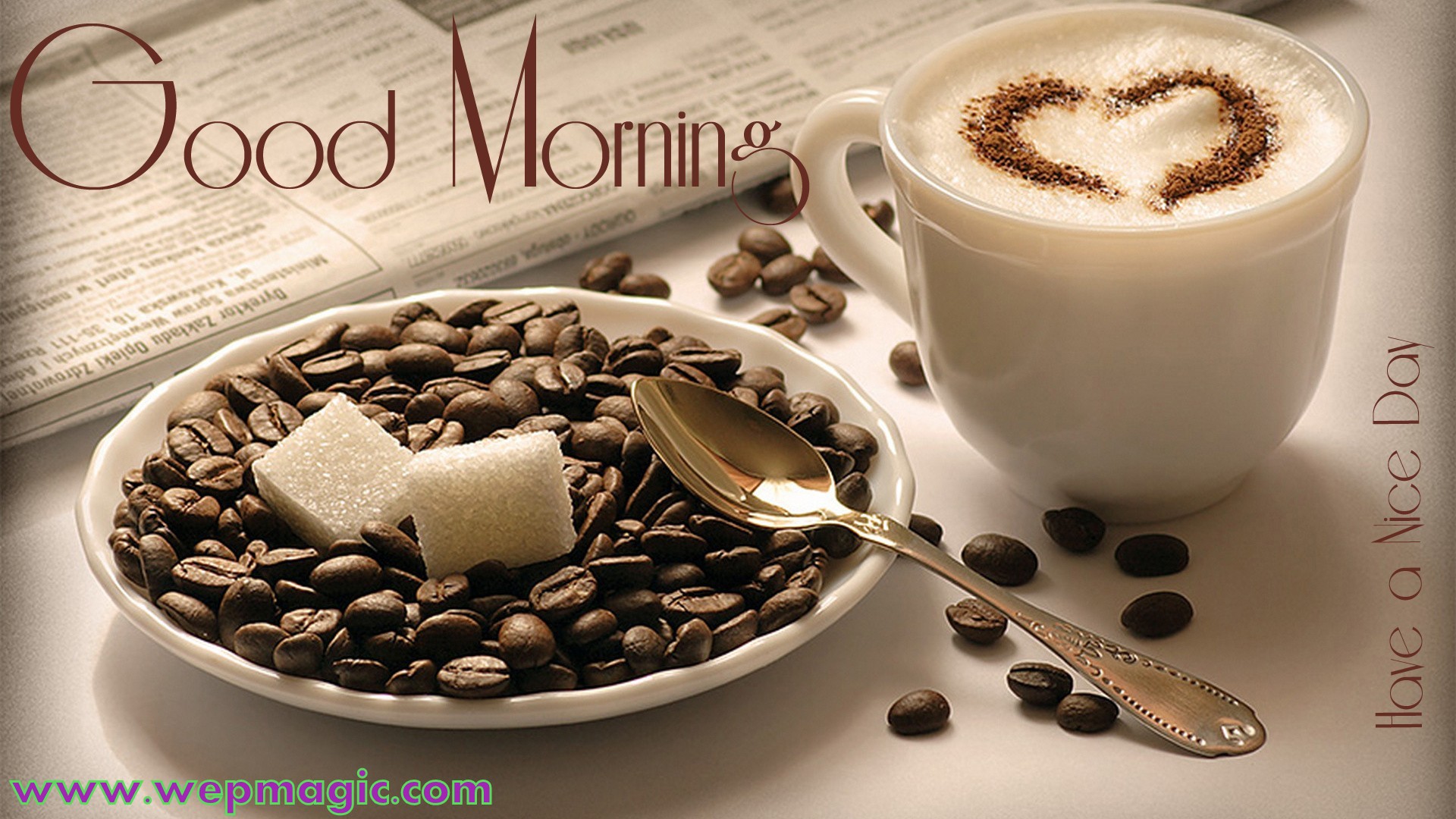 Description: A cup of coffee and a plate of beans with a heart on it and a spoon on a table.