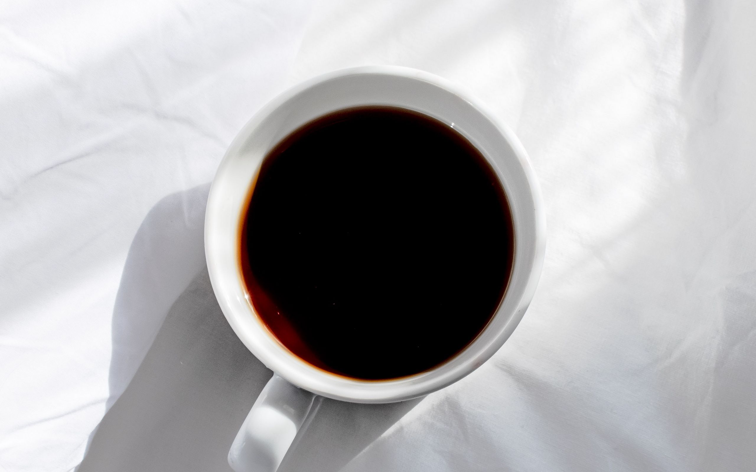 Description: A cup of coffee is sitting on a white surface with a shadow of a person's hand on the coffee cup.