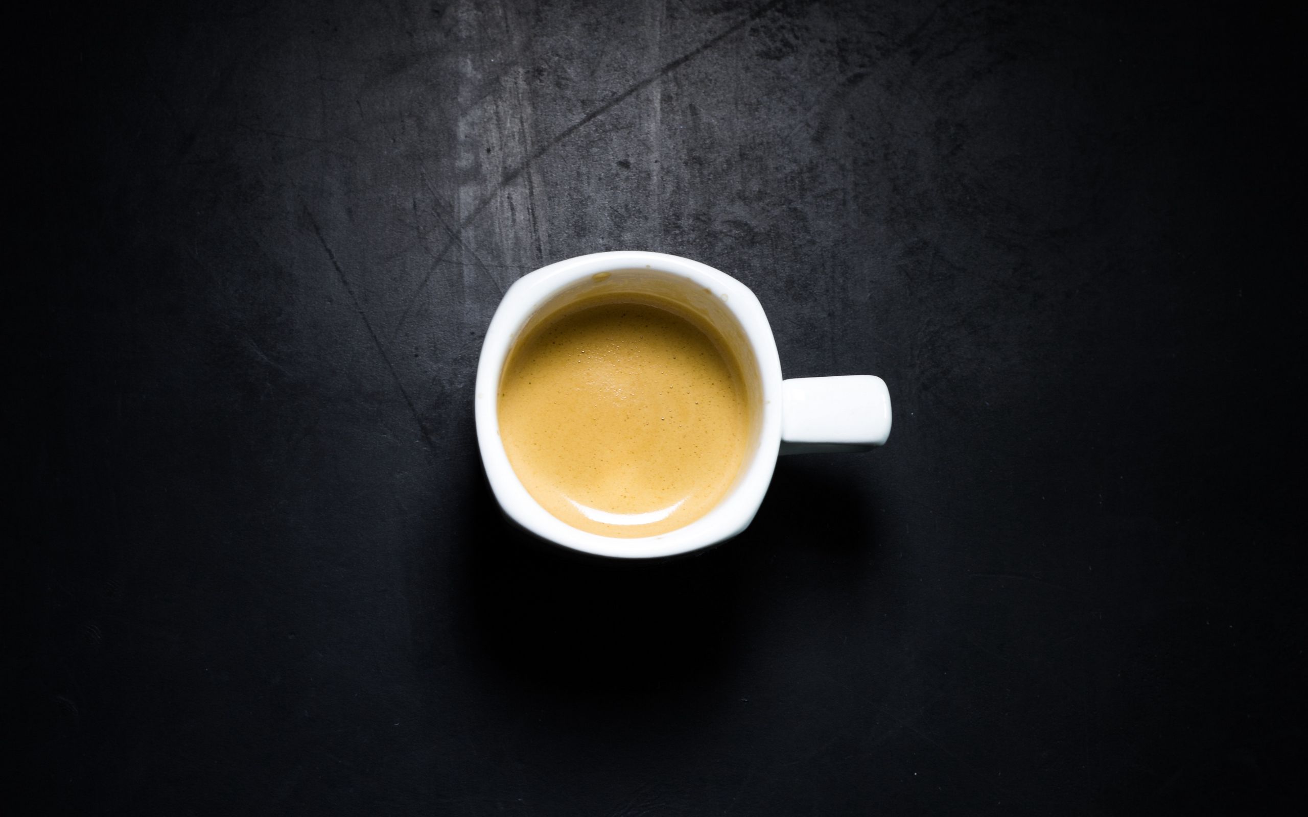 Description: A cup of coffee on a black table with a spoon in it and a spoon in the cup of coffee.