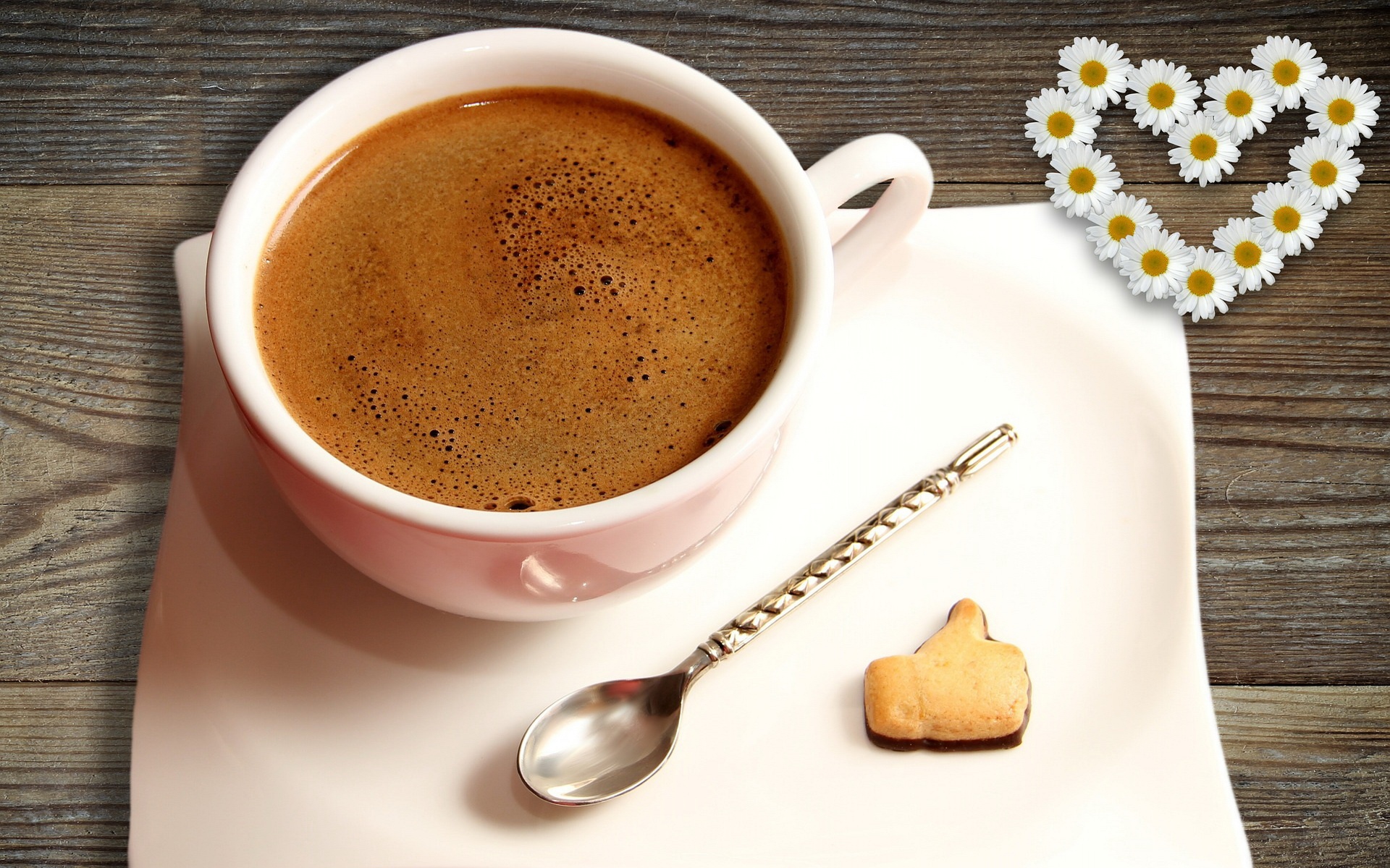 Description: A cup of coffee and a spoon on a plate with daisies on the side of the plate and a heart shaped cookie.