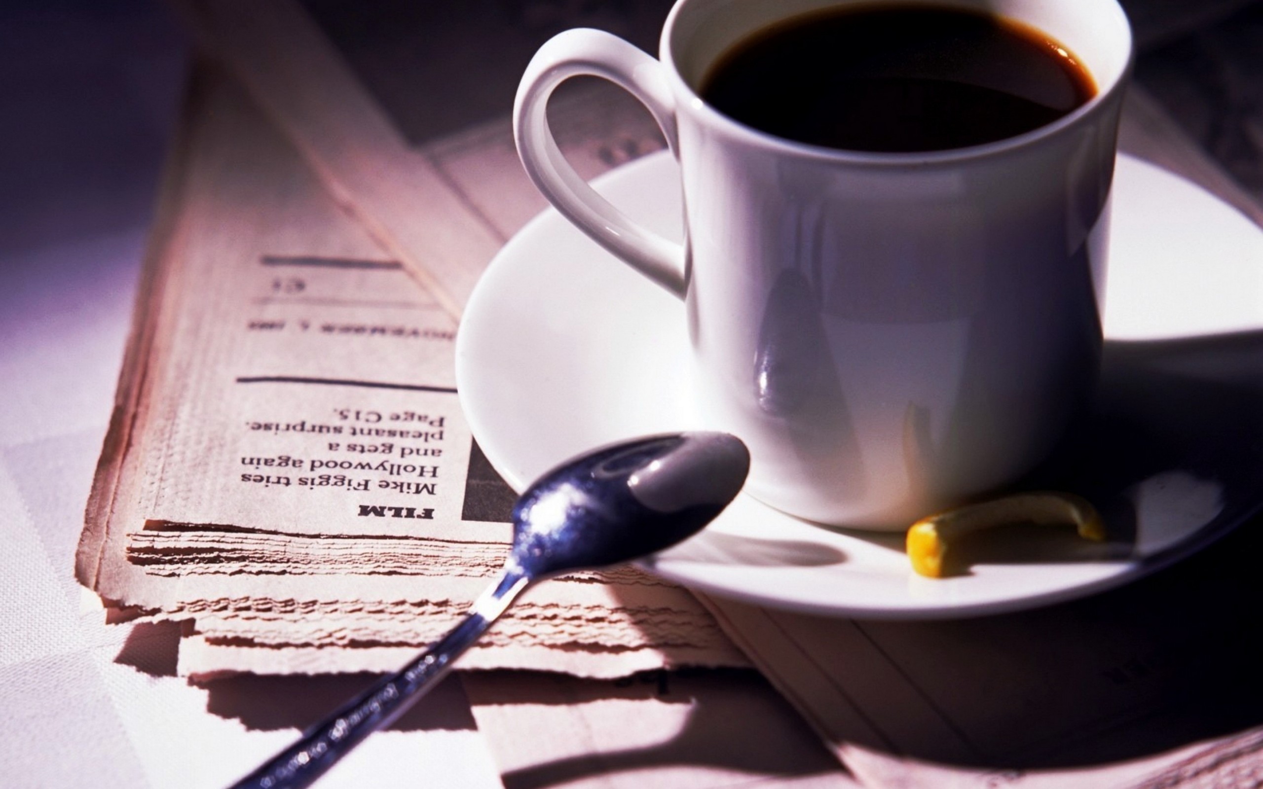 Description: A cup of coffee and a spoon on a saucer on a table with a newspaper and a newspaper.