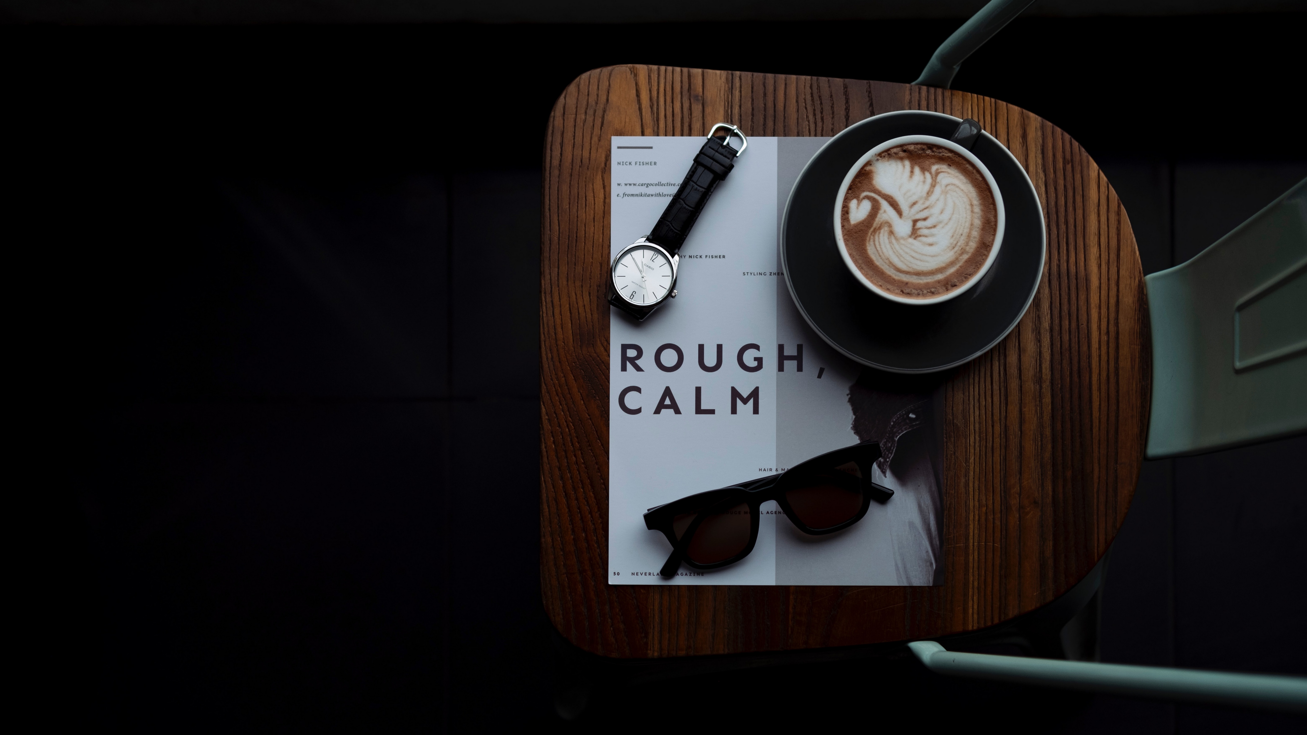 Description: A cup of coffee and a watch on a table with a sign that says rough calm on it and a watch.