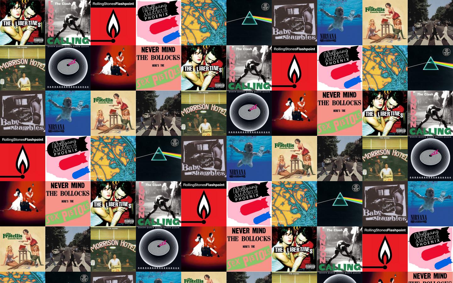 Description: A collage of various records and a record player on a wallpaper background with a woman in a white dress.