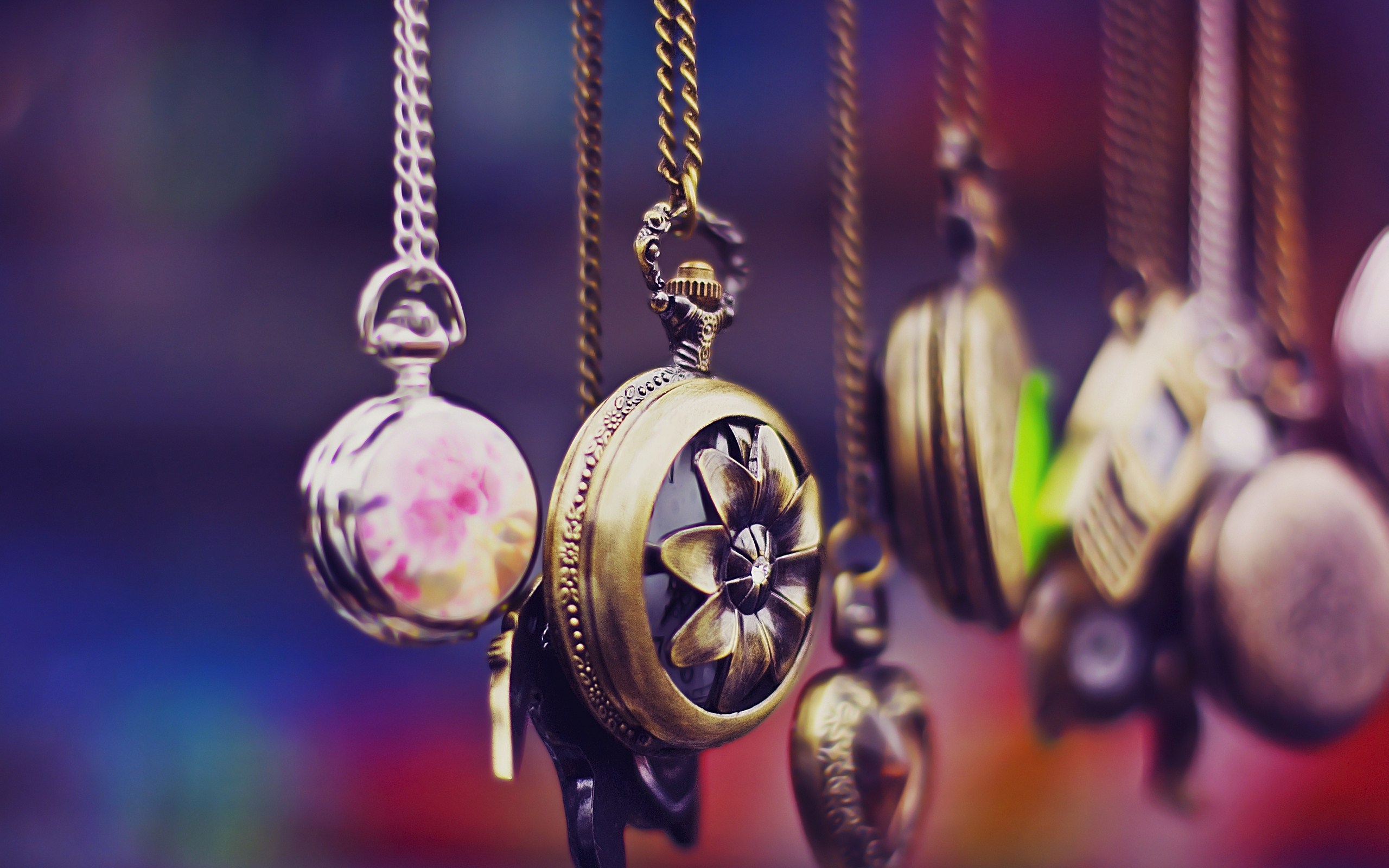 Description: A bunch of different colored clocks hanging from chains on a wall together.