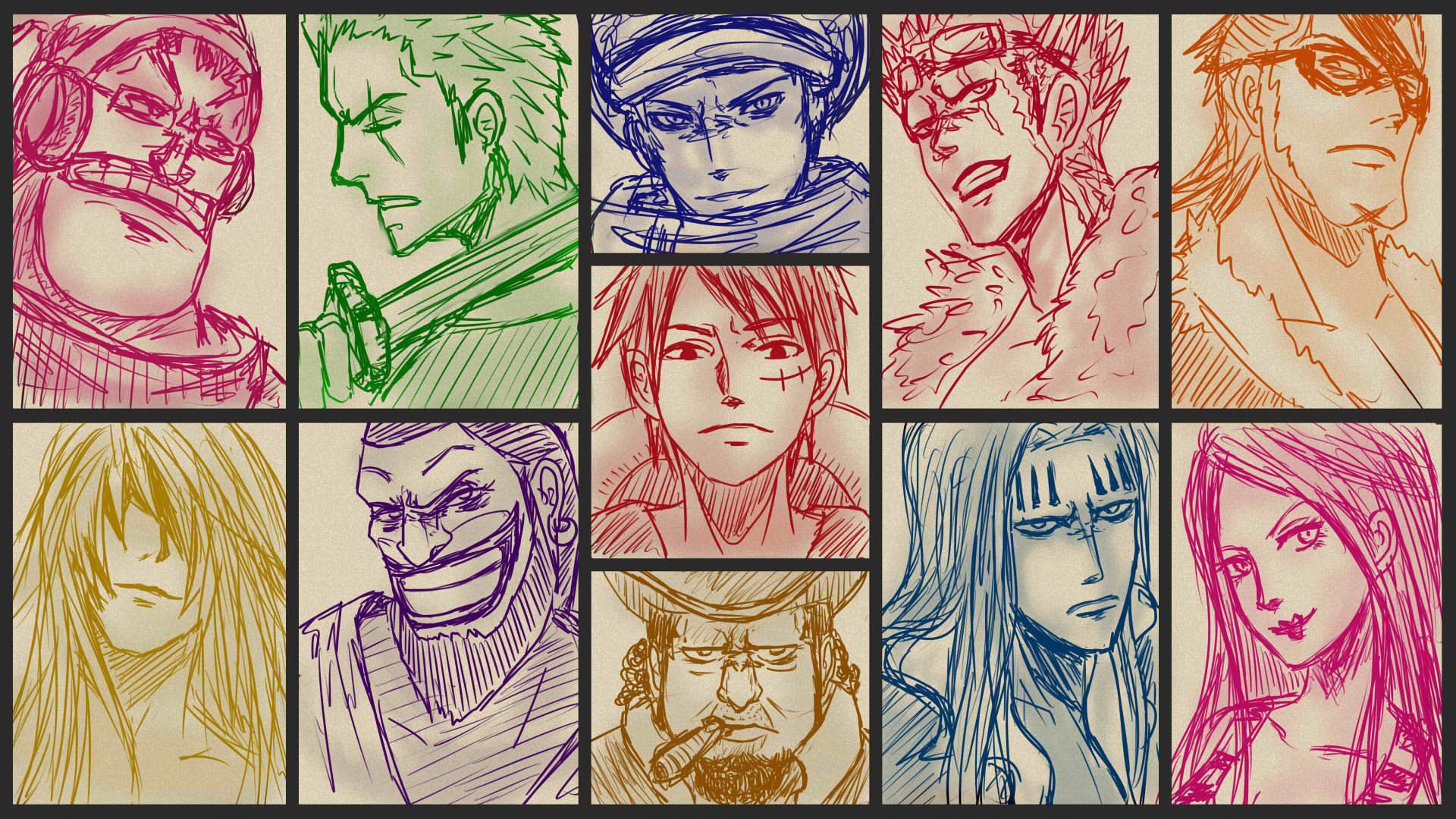 Description: A bunch of different colored drawings of people in different poses and expressions.