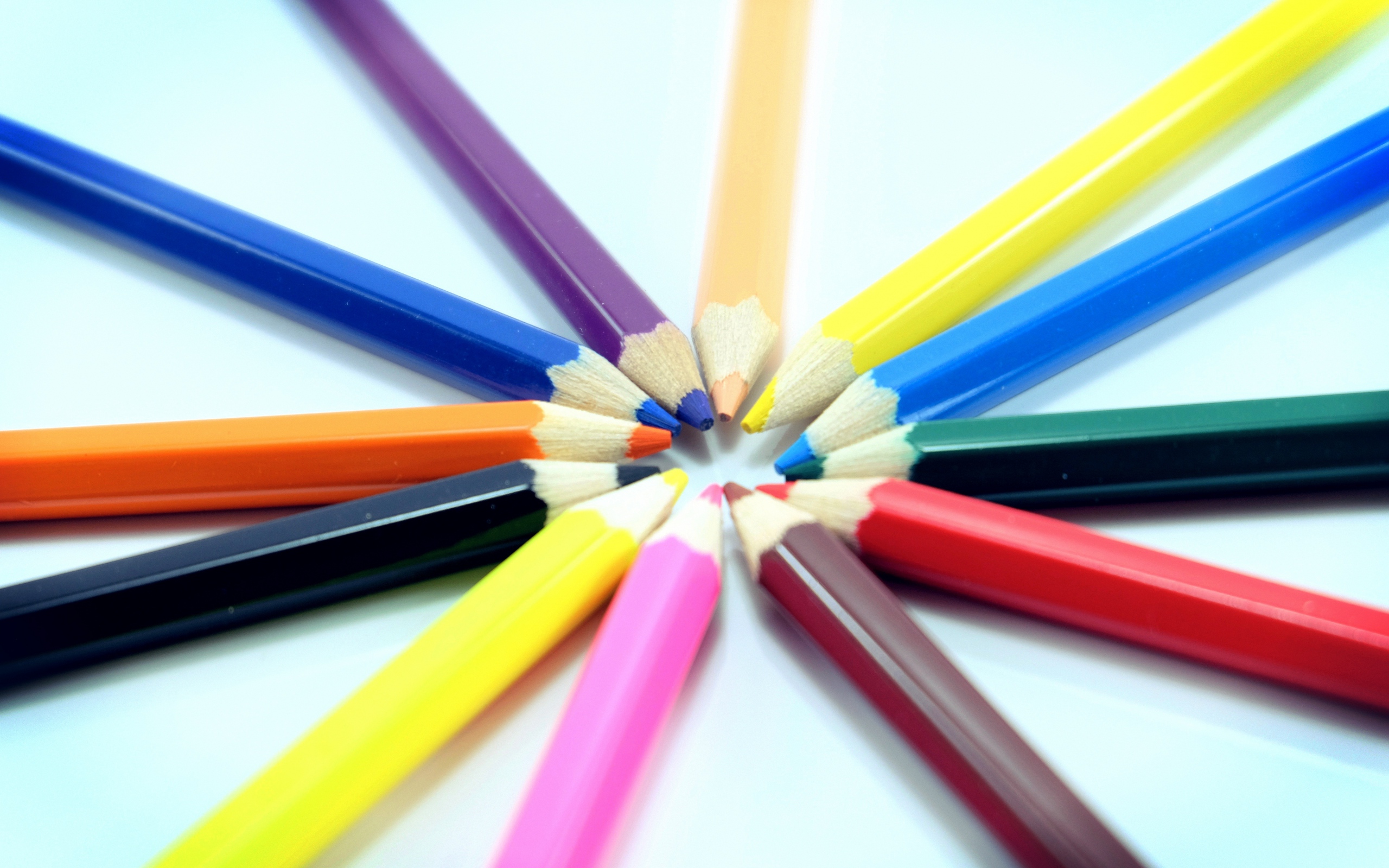 Description: A group of colored pencils arranged in a circle on a white surface with a blue background and a white background.