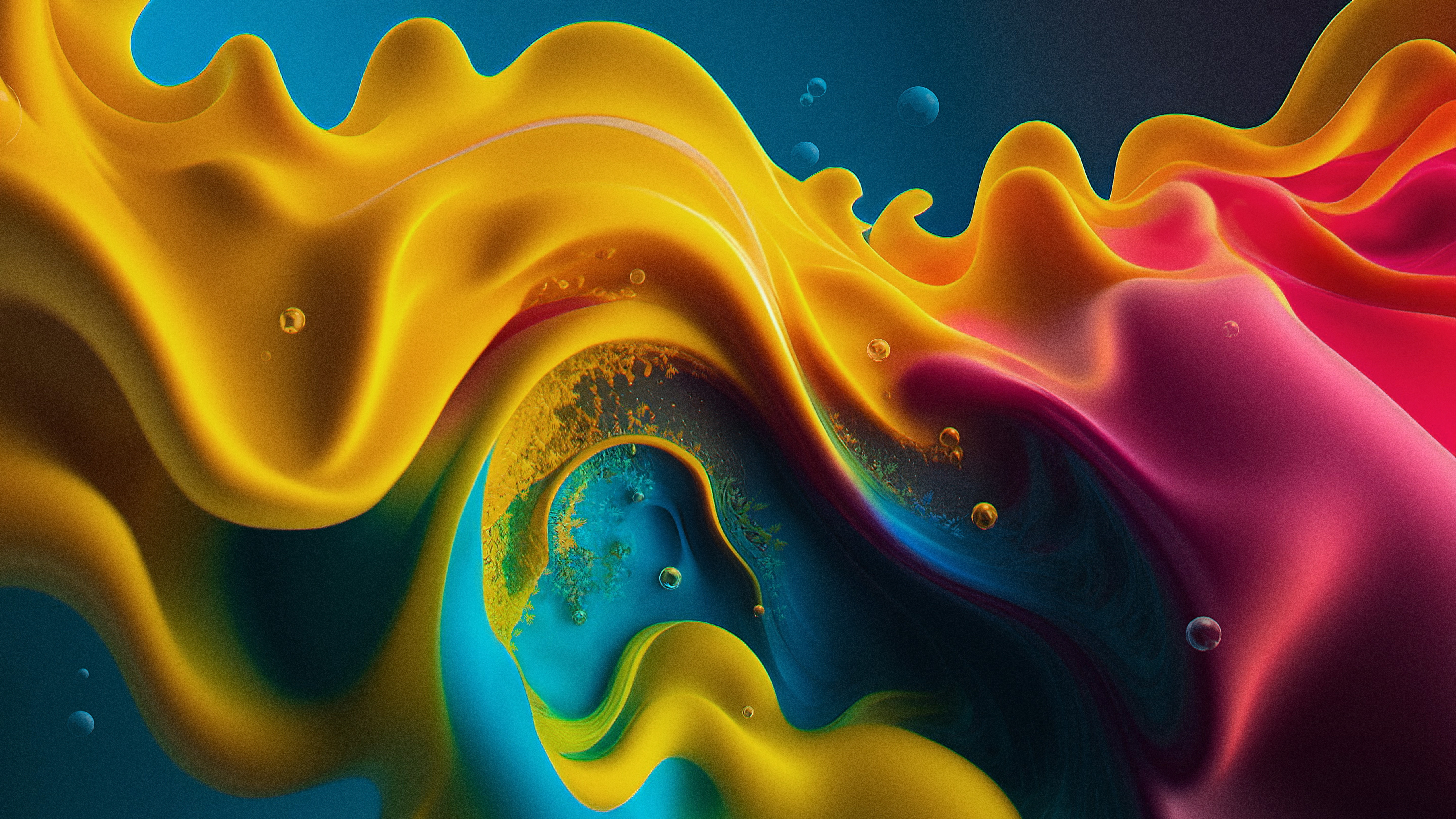 Description: A colorful abstract background with liquid and bubbles in the air and a blue background with a yellow and red swirl.