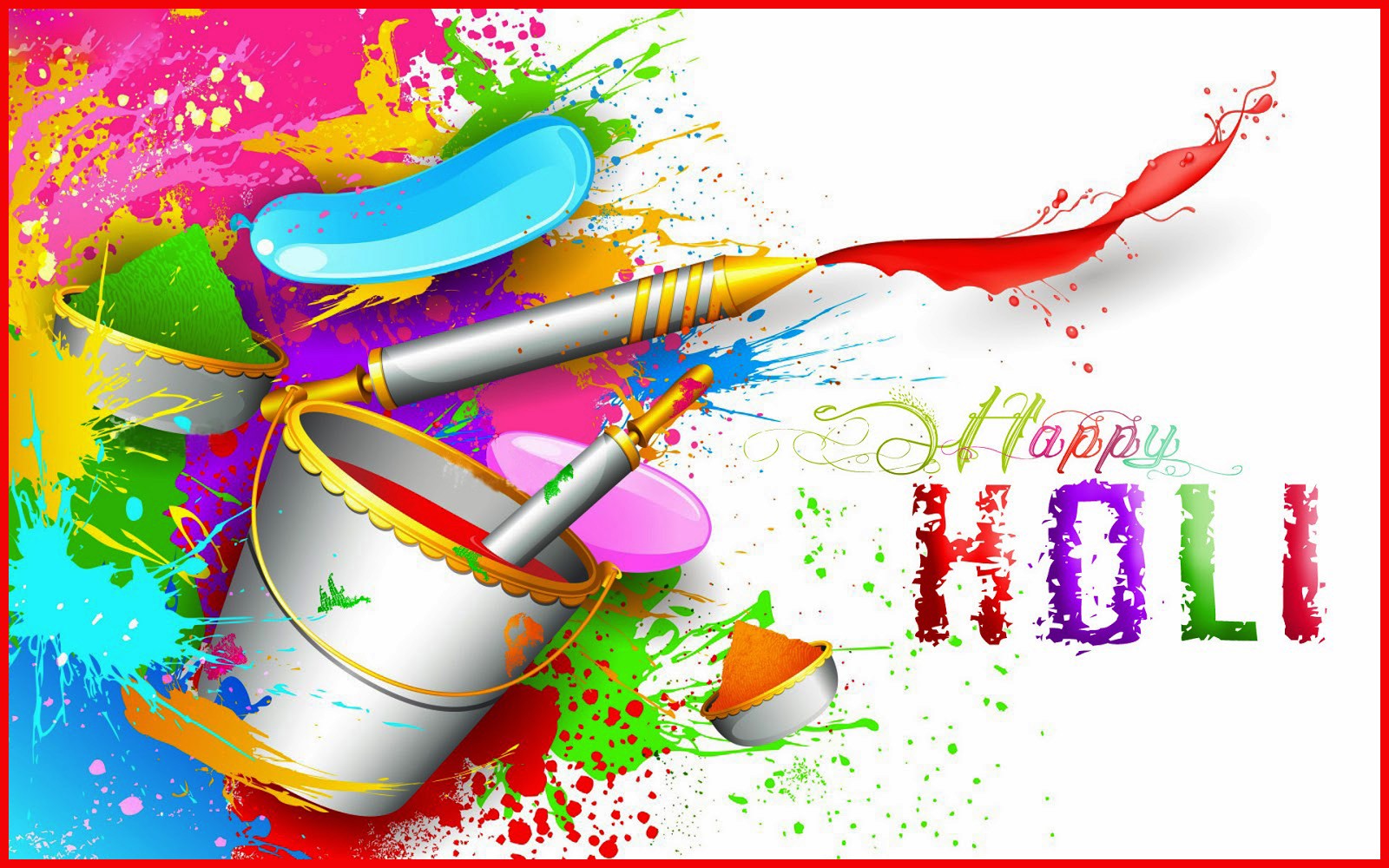Description: A colorful background with a paintbrush and a paint can with the words happy holi written on it.