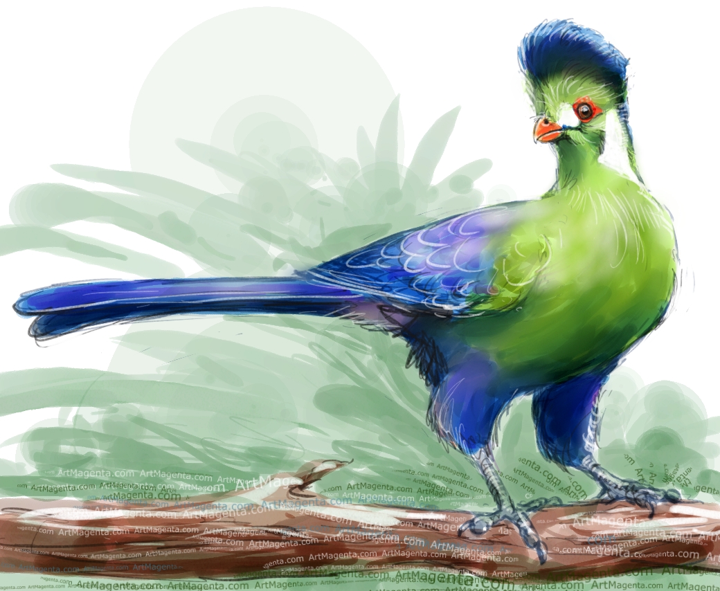 Description: A colorful bird with a blue head and tail standing on a branch with a green background and a white background.