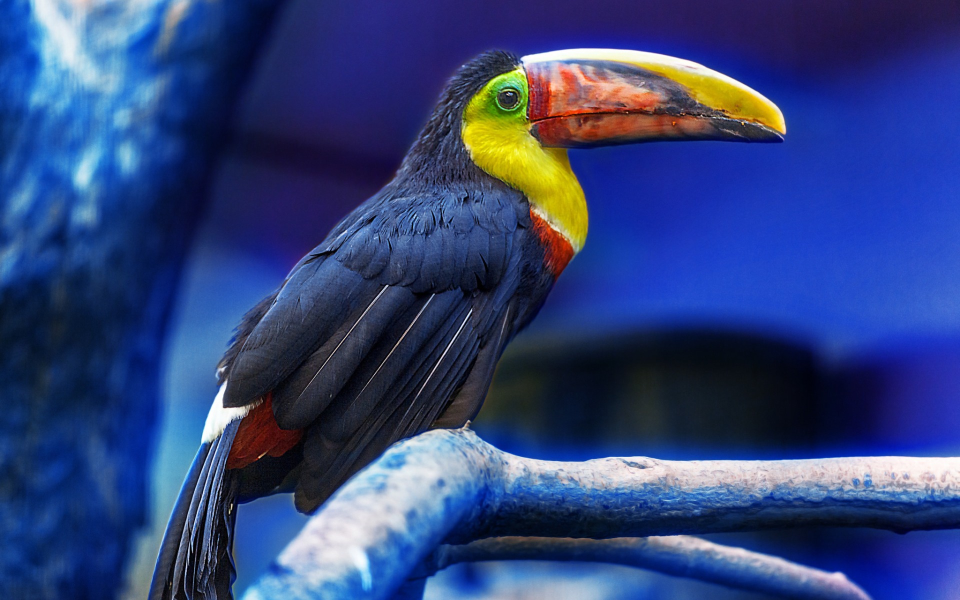 Description: A colorful bird sitting on a branch in a zoo exhibit area with blue walls and a blue ceiling behind it.