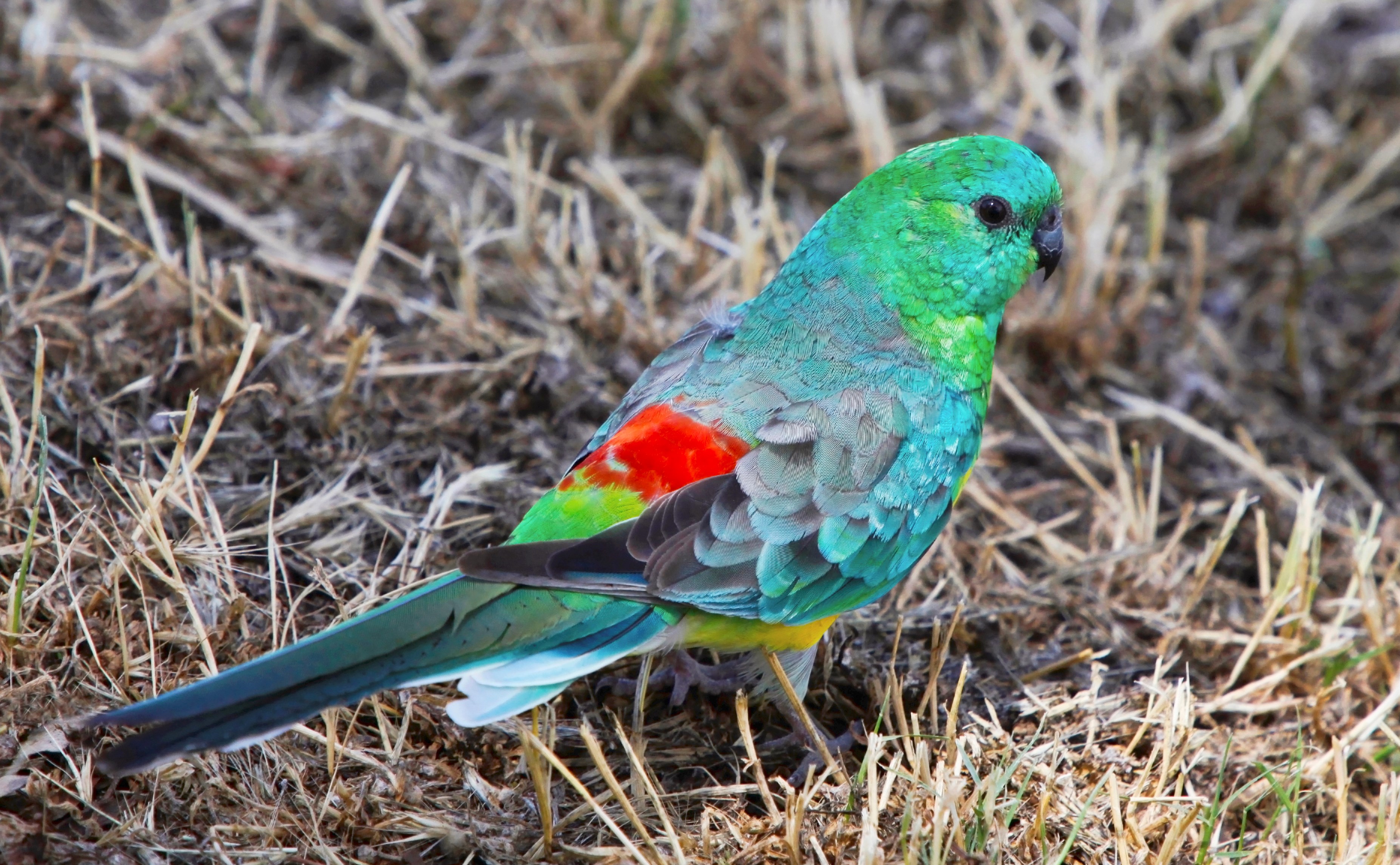 Description: A colorful bird standing on the ground in the grass and dirt area of a field with dead grass and dead grass.