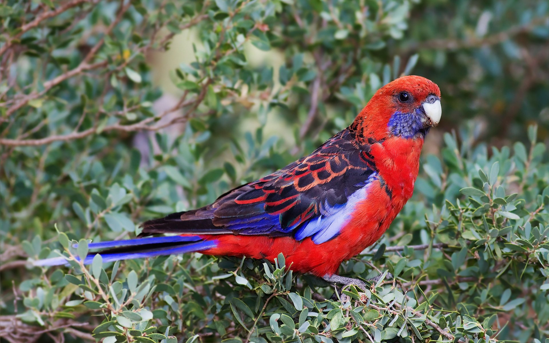 Description: A colorful bird perched on a tree branch in a tree branch filled with leaves and branches.