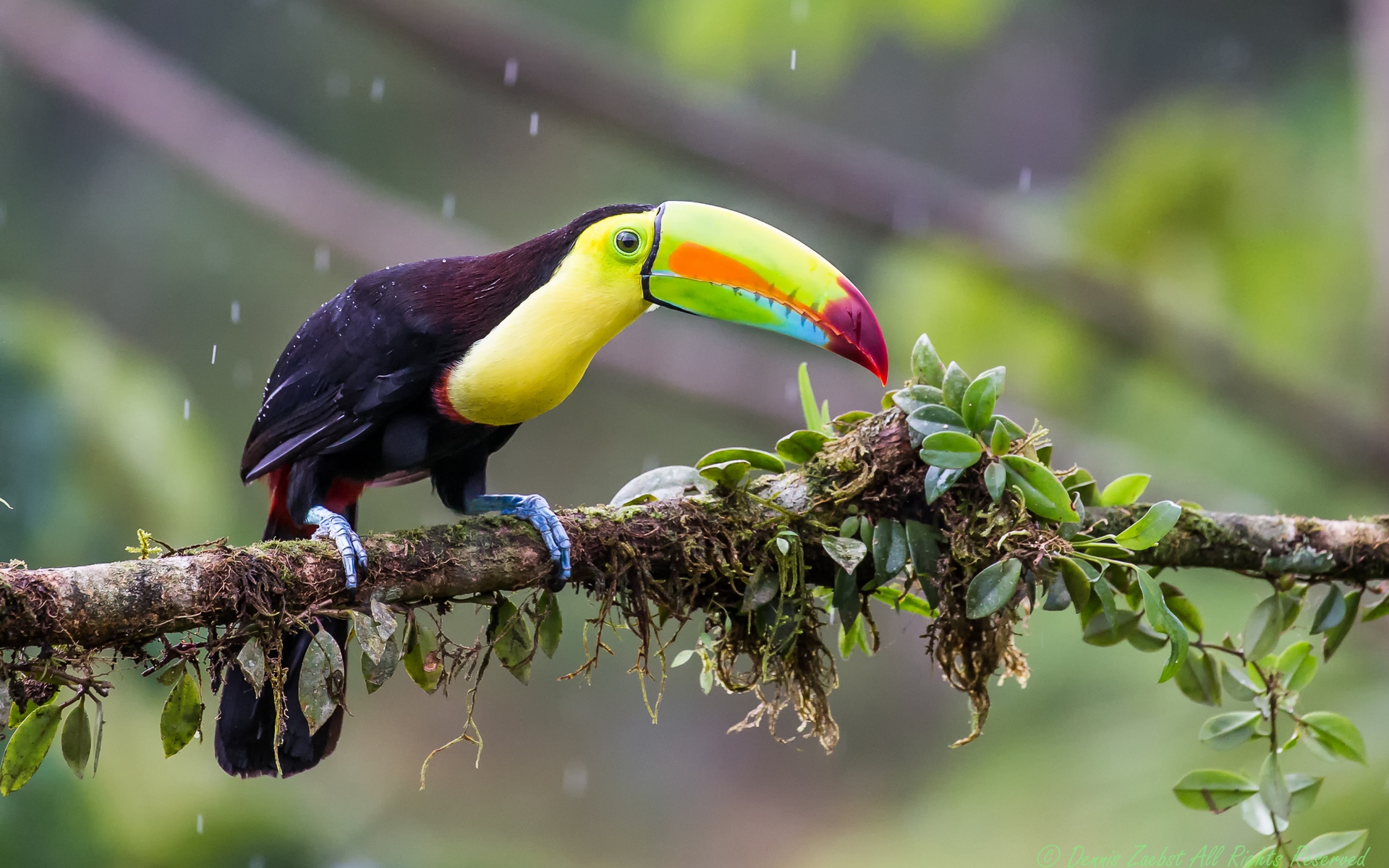 Description: A colorful bird perched on a branch in the rain with a colorful beak on it's head and a green and yellow beak.