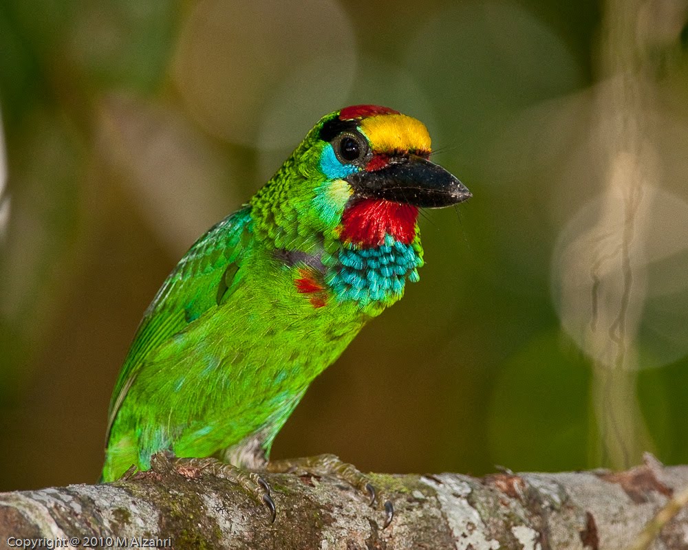 Description: A colorful bird perched on a tree branch in a forest area with blurry trees in the background and a blurred background.