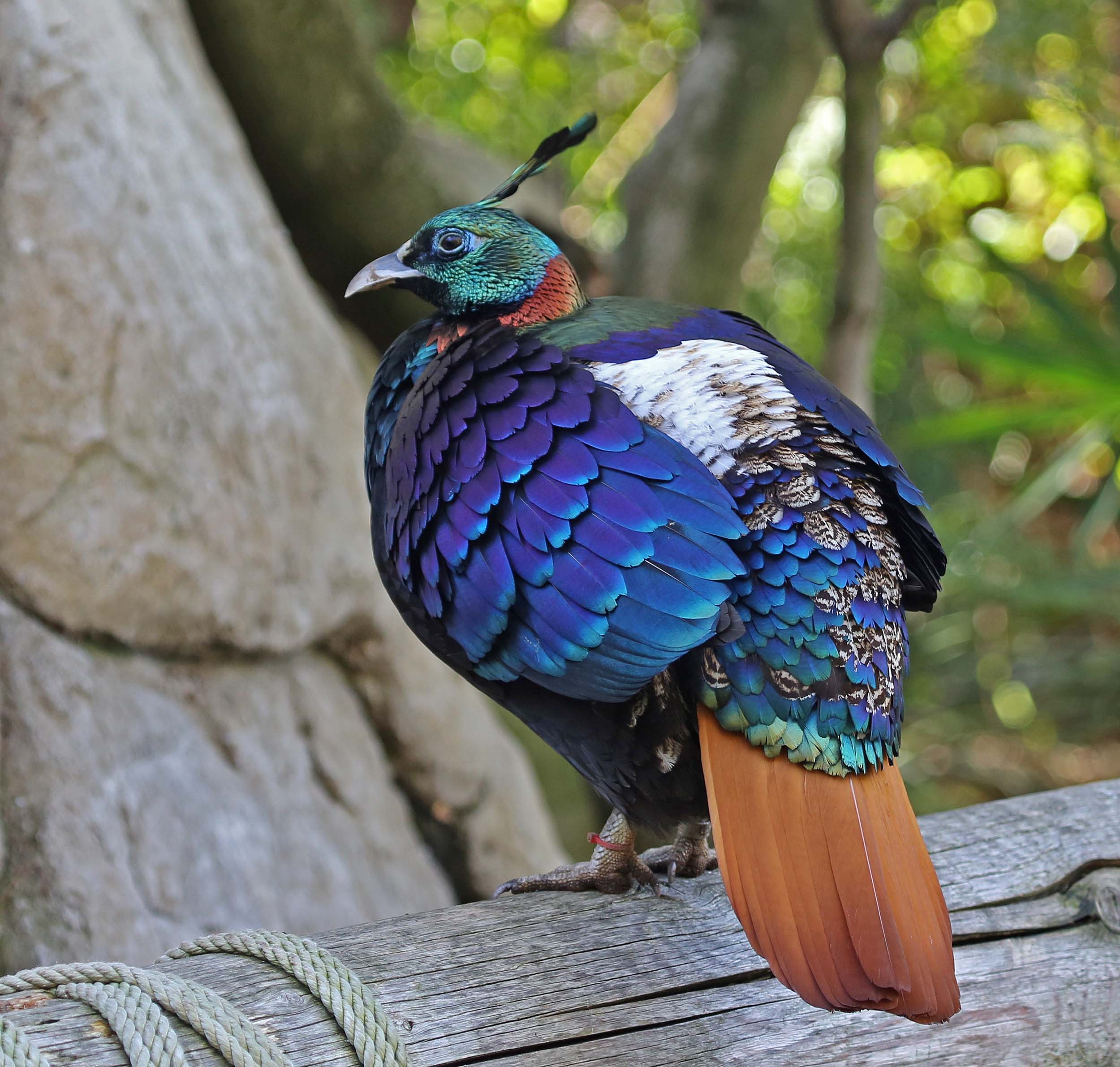 Description: A colorful bird sitting on a wooden plank in a forest area with trees in the background and a rope hanging from the side of the fence.