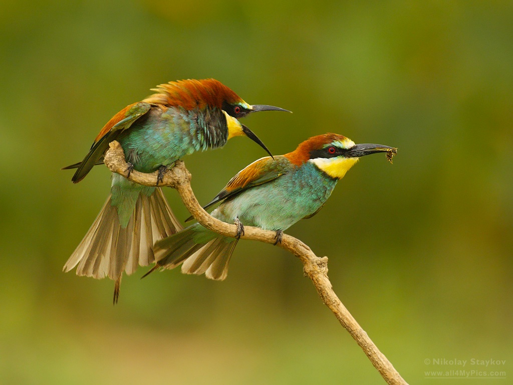 Description: Two colorful birds sitting on a branch with their beaks open and wings spread wide open.