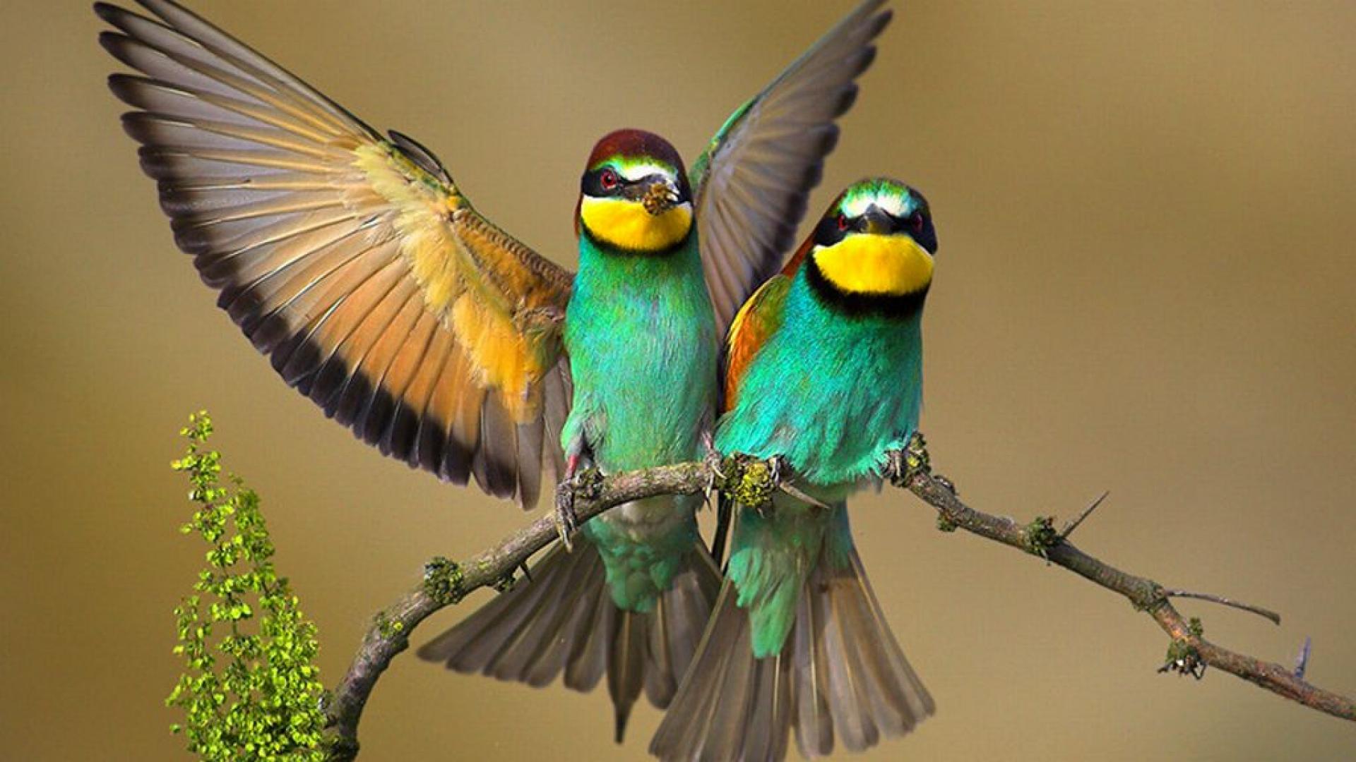 Description: Two colorful birds sitting on a branch with wings spread out and one bird is flying away from the other.