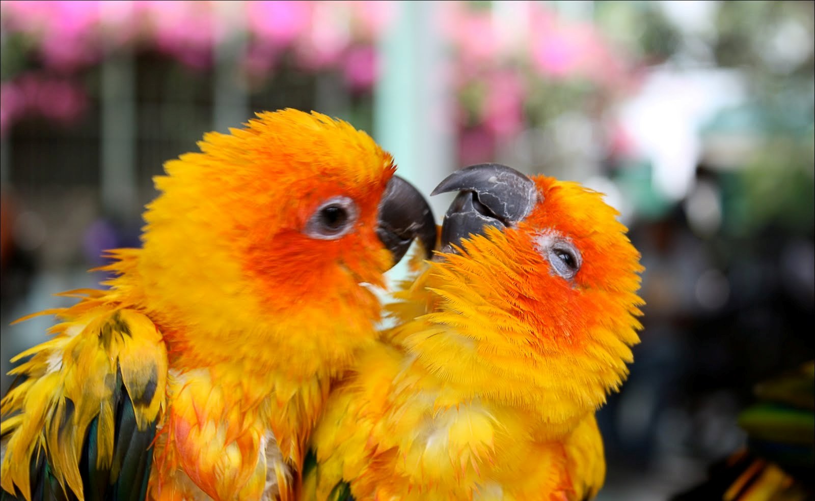 Description: Two colorful birds are standing next to each other on a branch in a zoo enclosure.