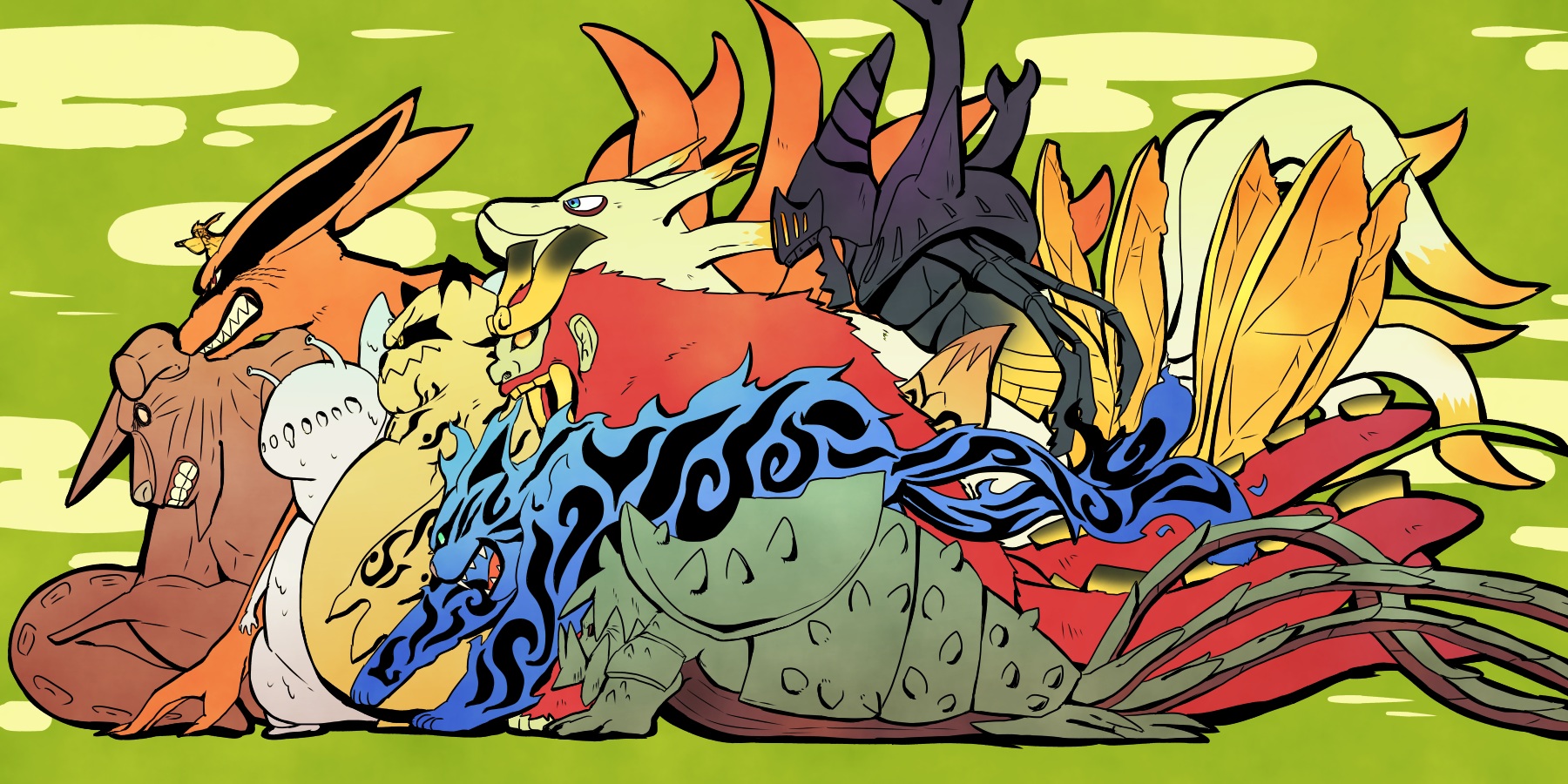Description: A group of different colored birds sitting on top of each other on a green surface with clouds in the background.