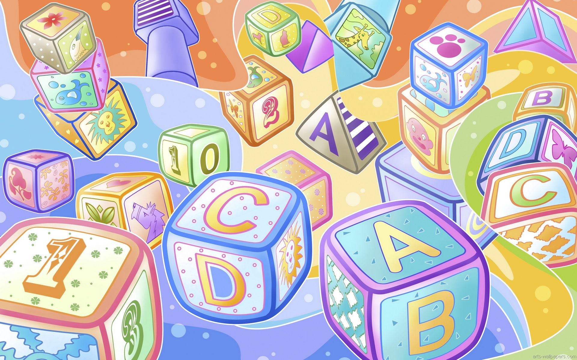 Description: A painting of a bunch of colorful blocks and numbers on a table top with a background of bubbles and stars.