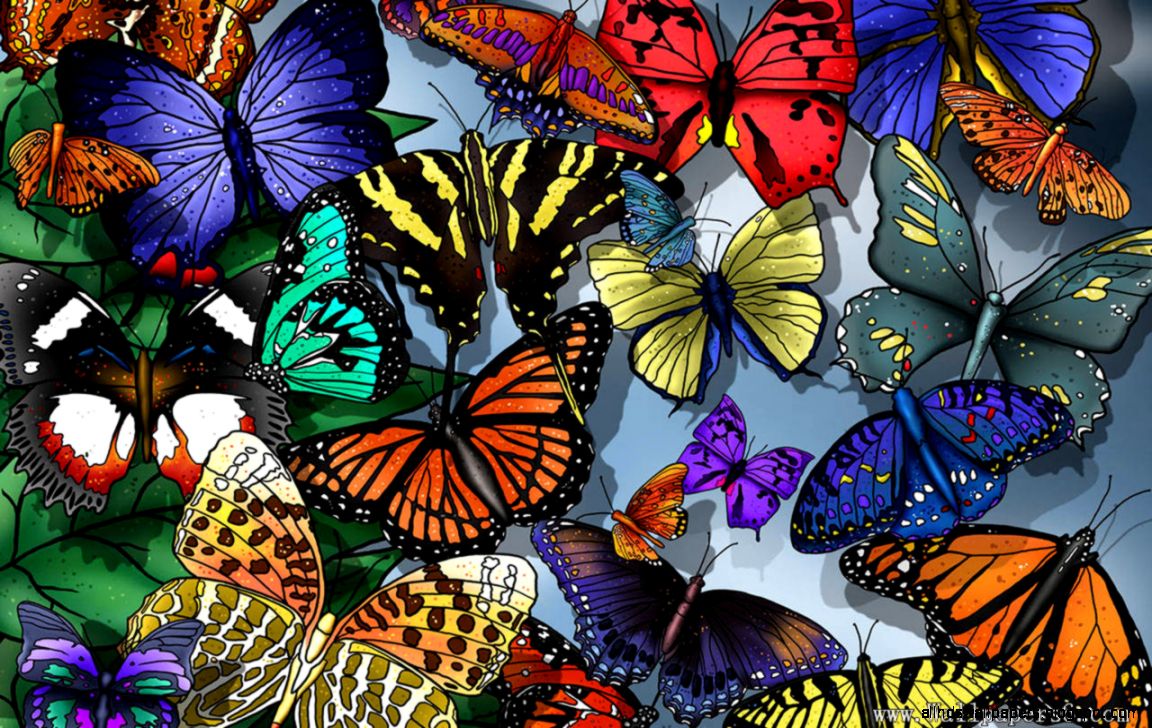 Description: A bunch of colorful butterflies flying in the sky together with a blue background and a black border around the image.