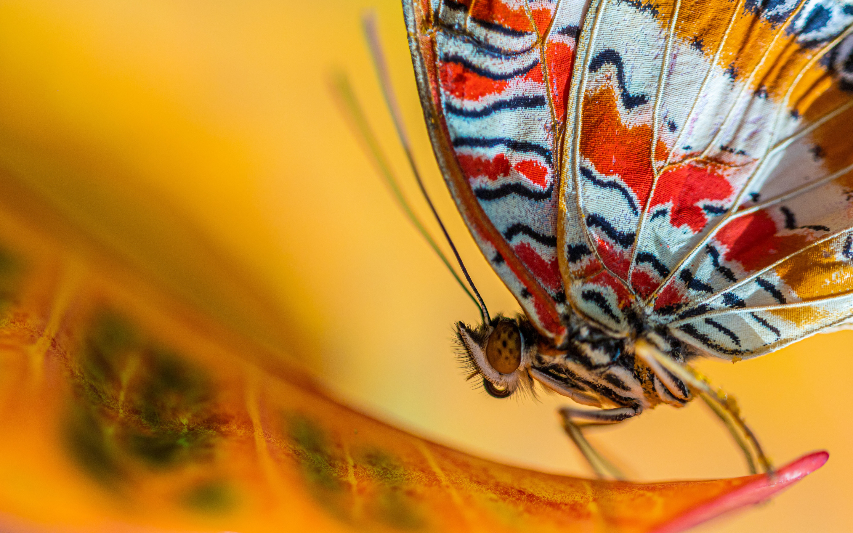 Description: A colorful butterfly sitting on a yellow flower stem with a blurry background of yellow and red leaves and a yellow flower.