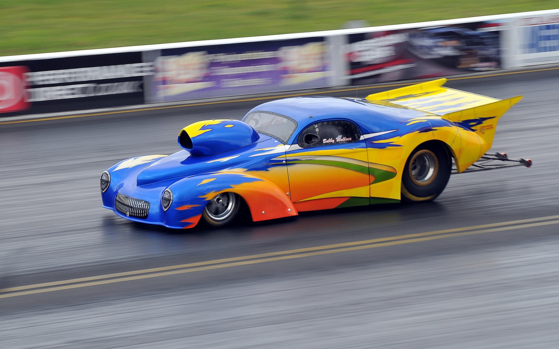 Description: A car with a colorful paint job driving down a track with a person in the back seat in the front.